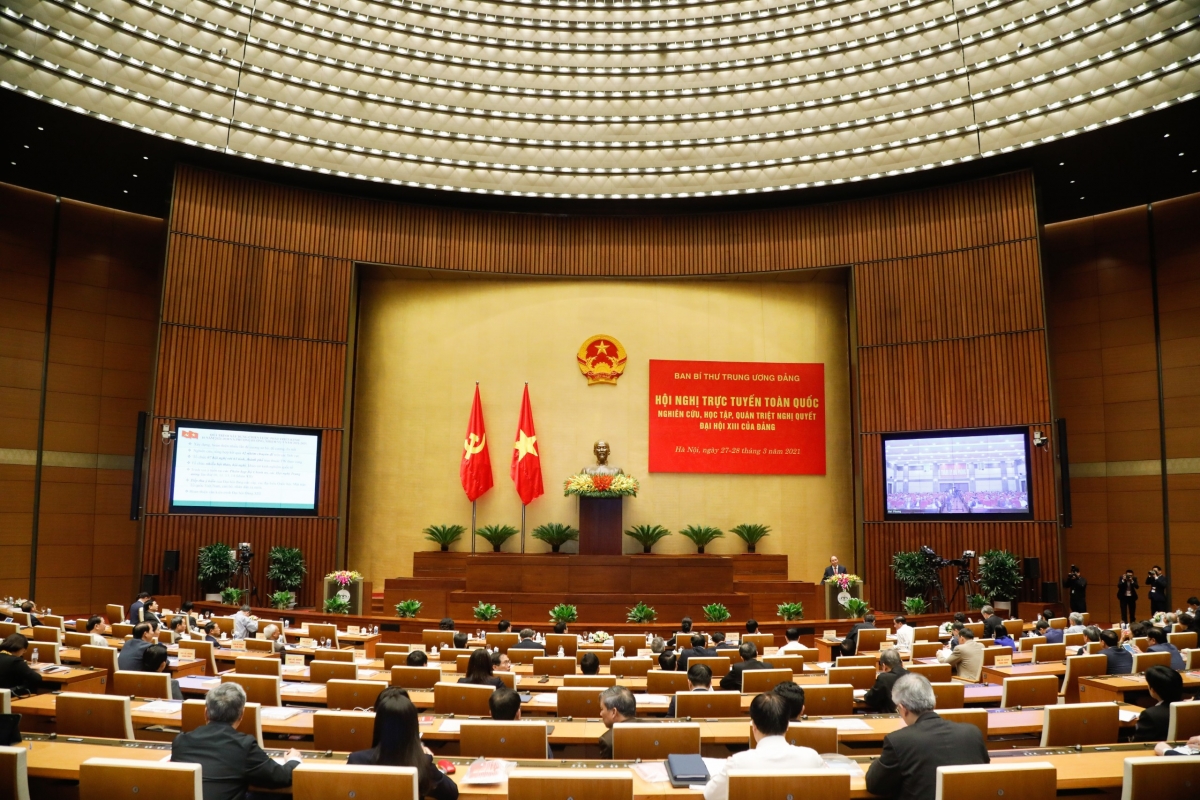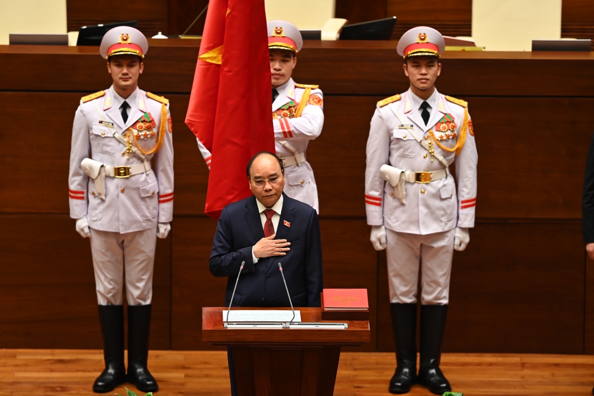 “Dưới cờ đỏ sao vàng thiêng liêng của Tổ quốc, trước Quốc hội và đồng bào cử tri cả nước, tôi – Chủ tịch nước CHXHCN Việt Nam xin tuyên thệ: Tuyệt đối trung thành với Tổ quốc, với Nhân dân, với Hiến pháp nước CHXHCN Việt Nam; ra sức công tác để hoàn thành tốt nhiệm vụ của Đảng, Nhà nước và Nhân dân giao phó” – Tân Chủ tịch nước Nguyễn Xuân Phúc tuyên thệ.