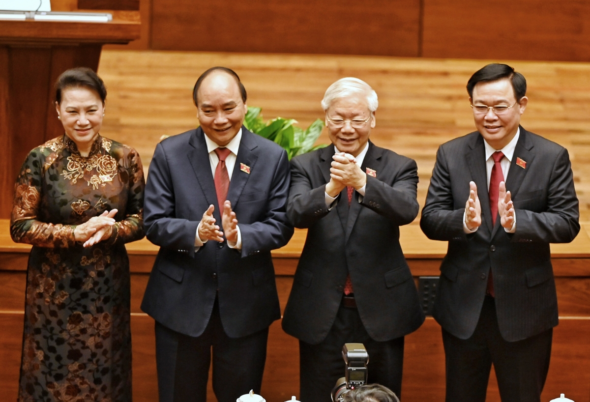 Tổng Bí thư Nguyễn Phú Trọng, Chủ tịch Quốc hội Vương Đình Huệ, nguyên Chủ tịch Quốc hội Nguyễn Thị Kim Ngân chúc mừng tân Chủ tịch nước Nguyễn Xuân Phúc.