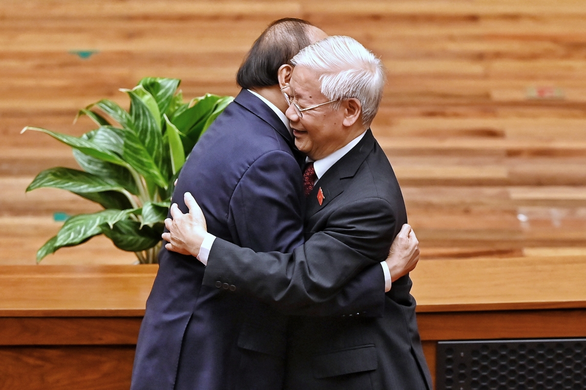 Chủ tịch nước Nguyễn Xuân Phúc tặng hoa Tổng Bí thư Nguyễn Phú Trọng.