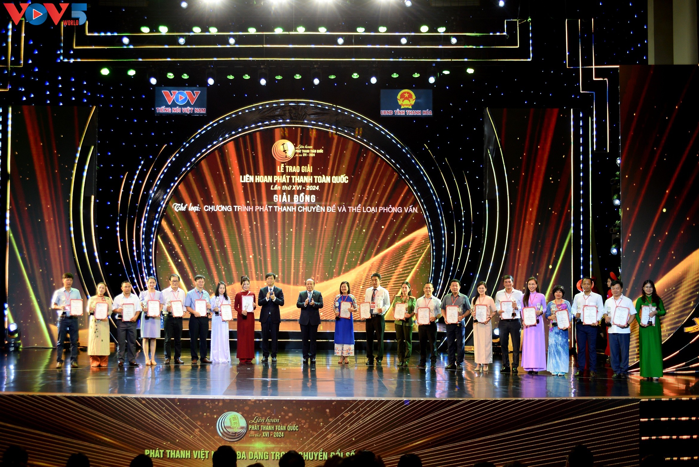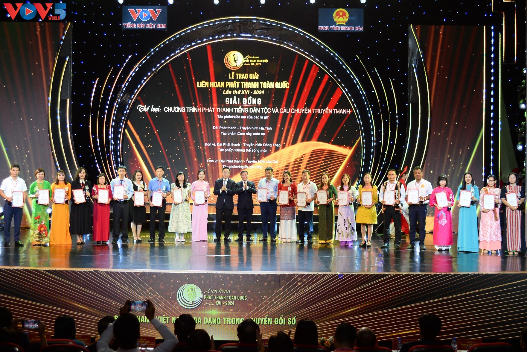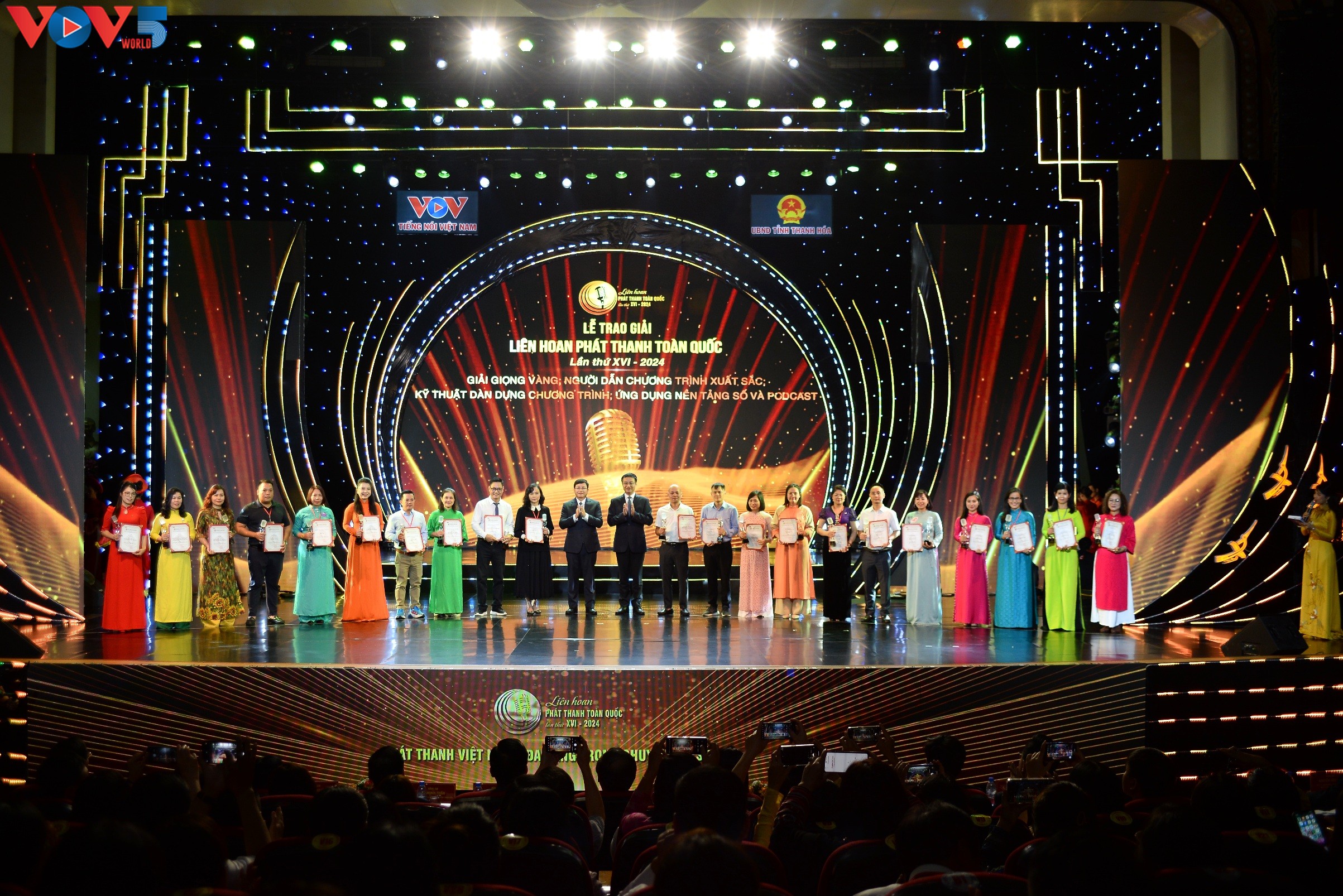 | Phó Bí thư chuyên trách Đảng ủy VOV Nguyễn Văn Chí và Phó Chủ tịch UBND tỉnh Thanh Hóa Mai Xuân Liêm trao các giải thưởng: Giọng vàng; Người dẫn chương trình xuất sắc; Kỹ thuật dàn dựng chương trình; Ứng dụng nền tảng số và giải thưởng Podcast. |