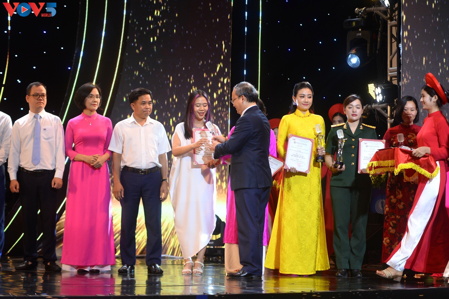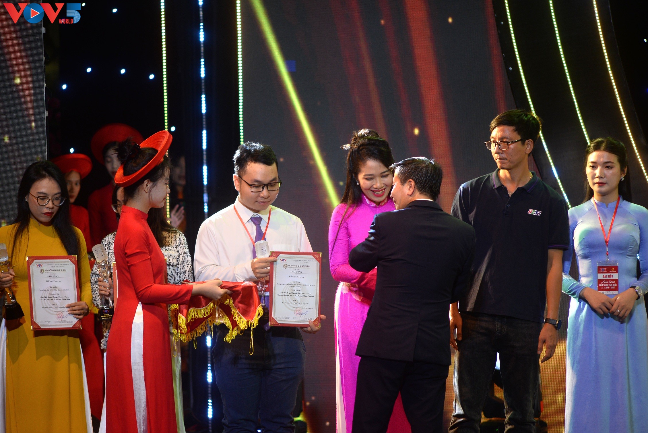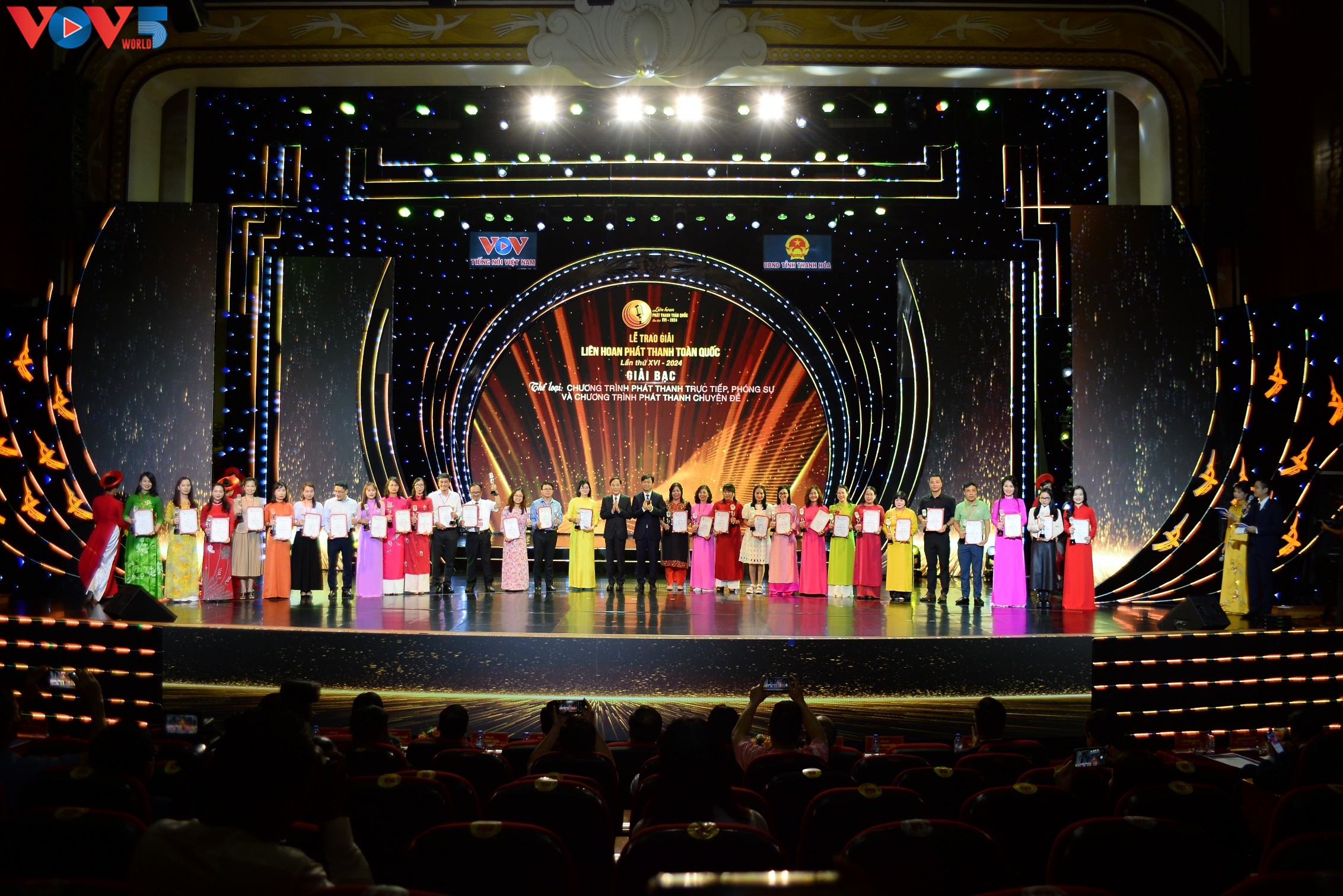 | Phó Bí thư chuyên trách Đảng ủy VOV Nguyễn Văn Chí và Phó Chủ tịch UBND tỉnh Thanh Hóa Mai Xuân Liêm trao các giải thưởng: Giọng vàng; Người dẫn chương trình xuất sắc; Kỹ thuật dàn dựng chương trình; Ứng dụng nền tảng số và giải thưởng Podcast. |