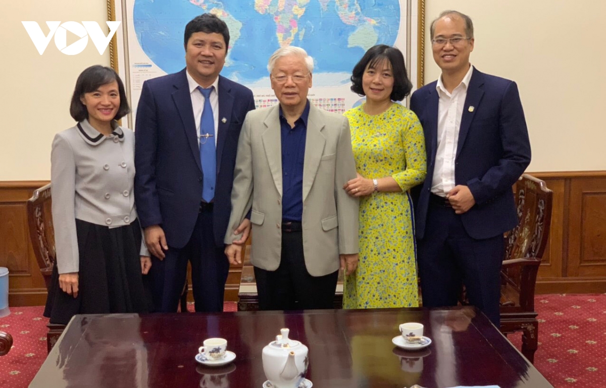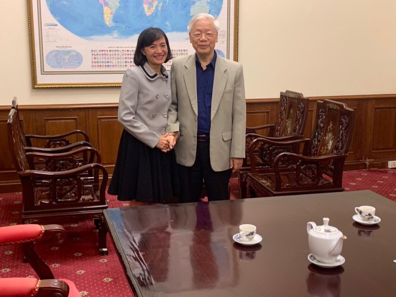 Tác giả Khương Thủy chụp hình lưu niệm cùng Tổng Bí thư, Chủ tịch nước Nguyễn Phú Trọng. |