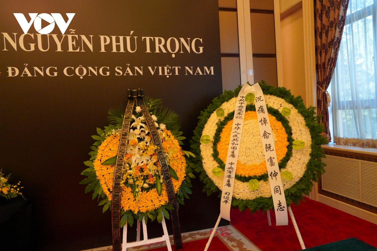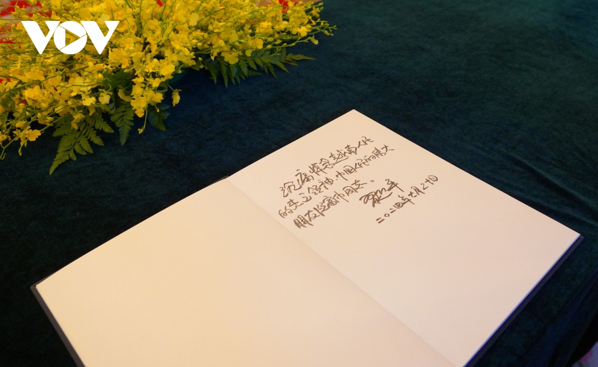 Sổ tang ghi dòng chữ: "Vô cùng thương tiếc đồng chí Nguyễn Phú Trọng, lãnh tụ kiệt xuất của nhân dân Việt Nam, người bạn vĩ đại của nhân dân Trung Quốc". |