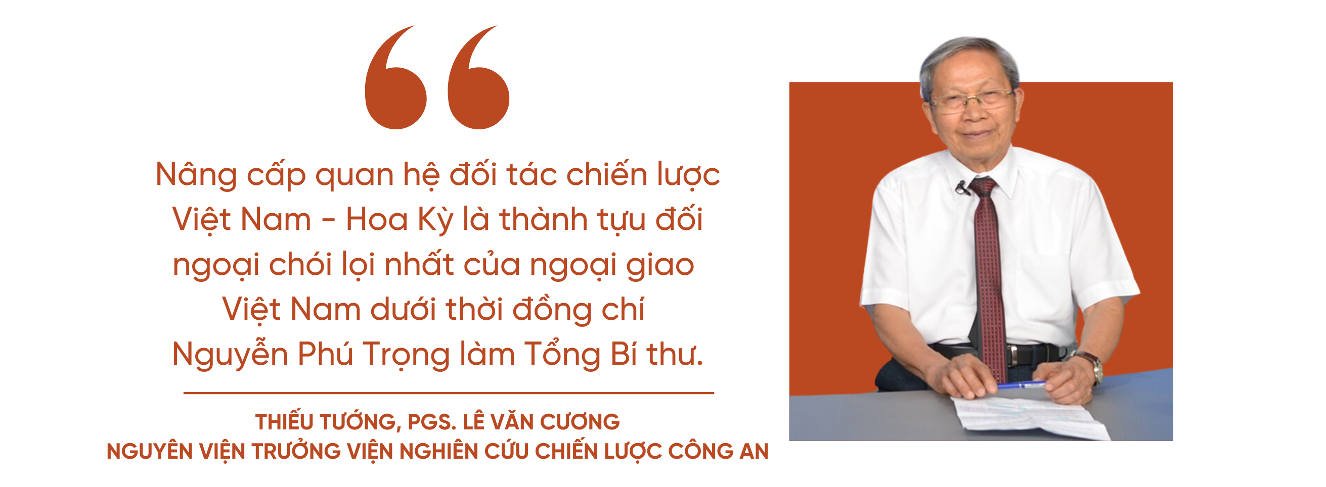Thiếu tướng Lê Văn Cương nhận định, việc nâng cấp quan hệ ngoại giao Việt-Mỹ lên Đối tác chiến lược toàn diện vào tháng 9/2023 “là một bước ngoặt lớn, là một bước đi cân não tại thời điểm cuộc xung đột Nga-Ukraine đang diễn phức tạp, ghi dấu ấn của Tổng Bí thư Nguyễn Phú Trọng”, ông Lê Văn Cương.