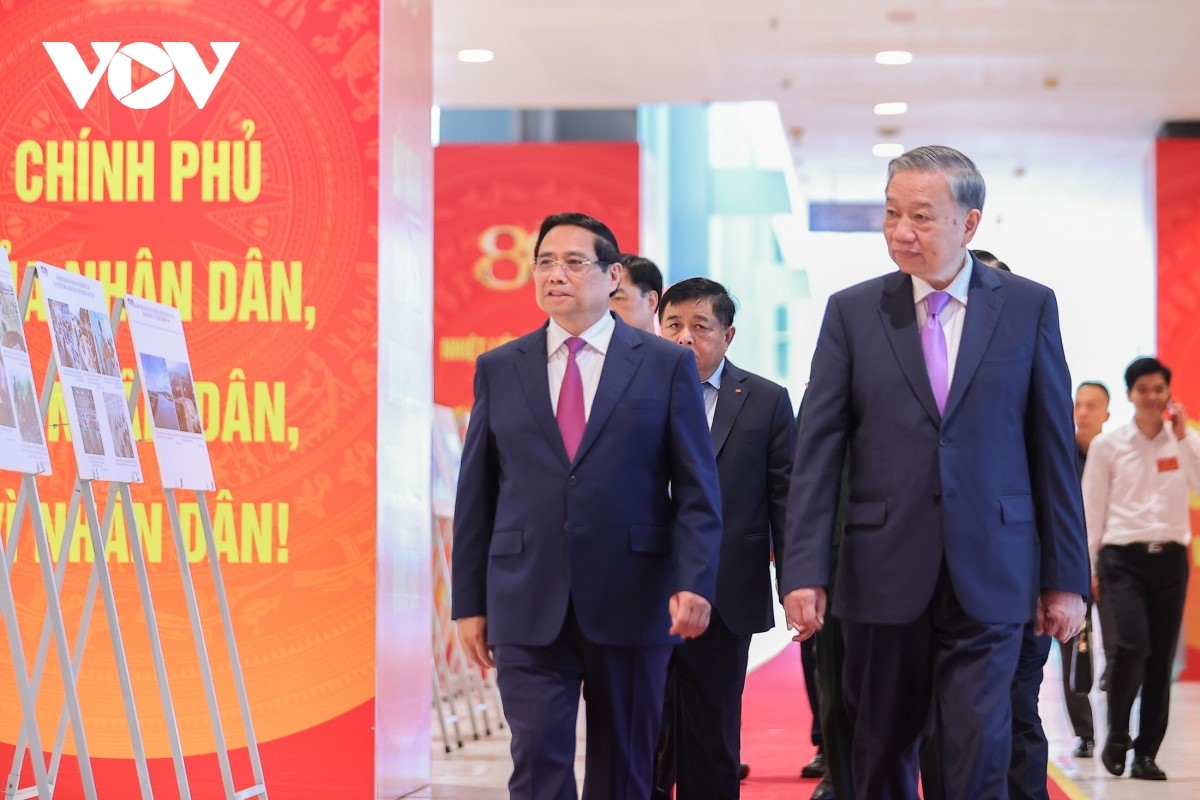 Tổng Bí thư Tô Lâm, Thủ tướng Phạm Minh Chính tham quan triển lãm ảnh về truyền thống 80 năm Chính phủ nước CHXHCN Việt Nam. |