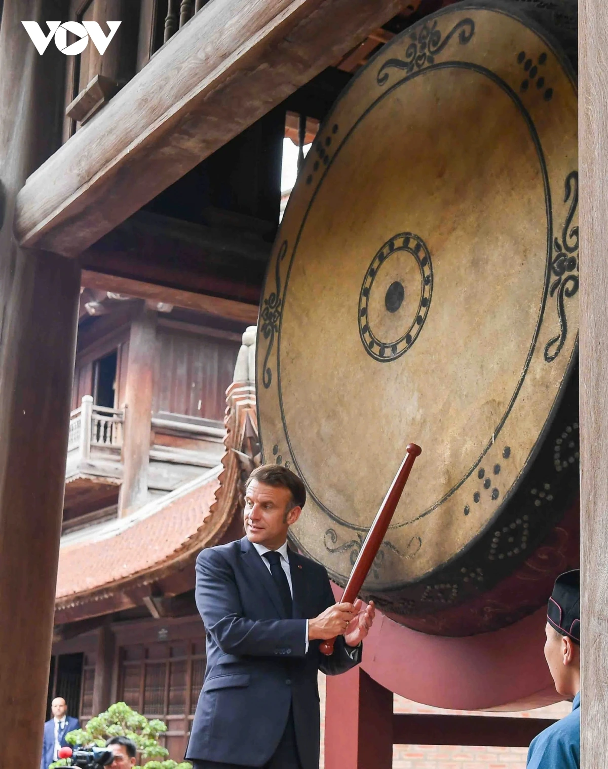 | Tổng thống Pháp Emmanuel Macron đánh 3 tiếng trống tại Văn Miếu-Quốc Tử Giám. |