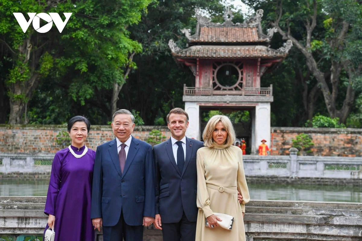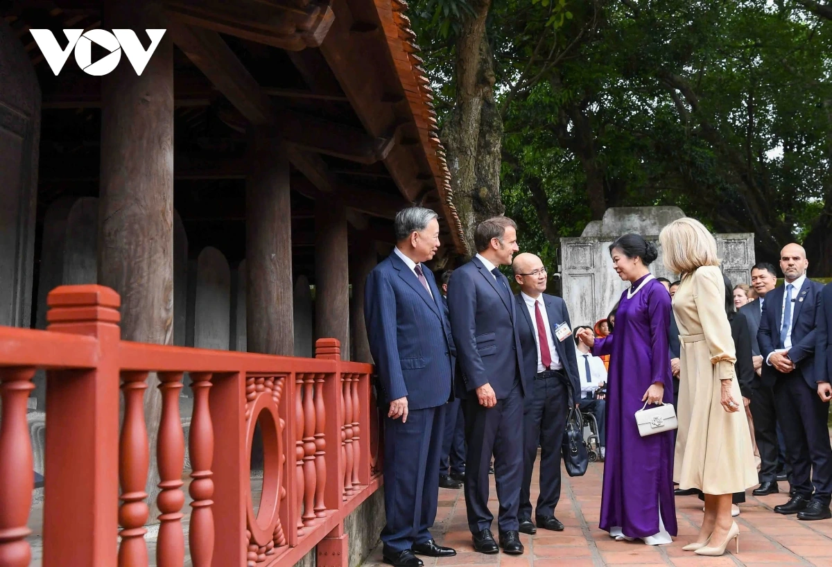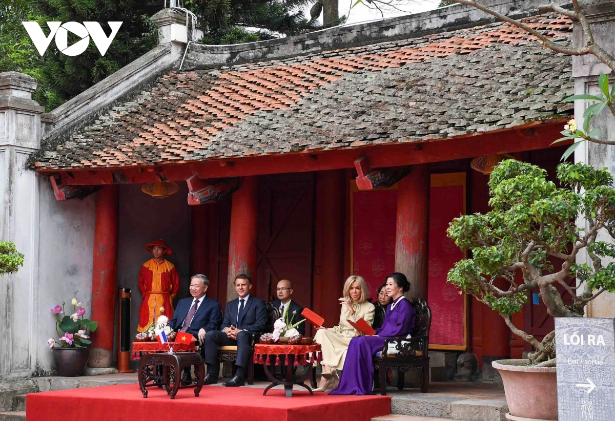| Tổng Bí thư Tô Lâm và Phu nhân cùng Tổng thống Pháp Emmanuel Macron và Phu nhân nghe giới thiệu về Khuê Văn Các, xem múa rối nước bên cạnh giếng Thiền Quang, xem Nhã nhạc Cung đình Huế tại sân chính Văn Miếu và thưởng thức nhạc nhẹ, dân ca mang đậm bản sắc văn hóa Việt Nam. |
