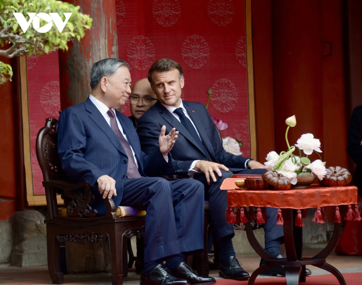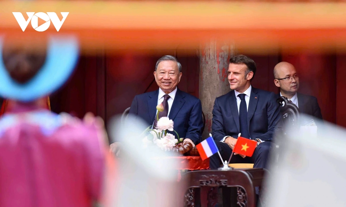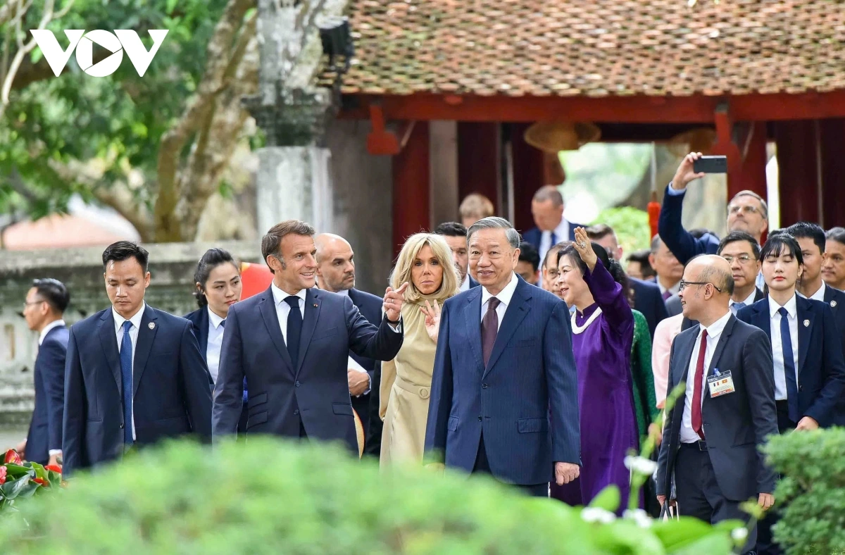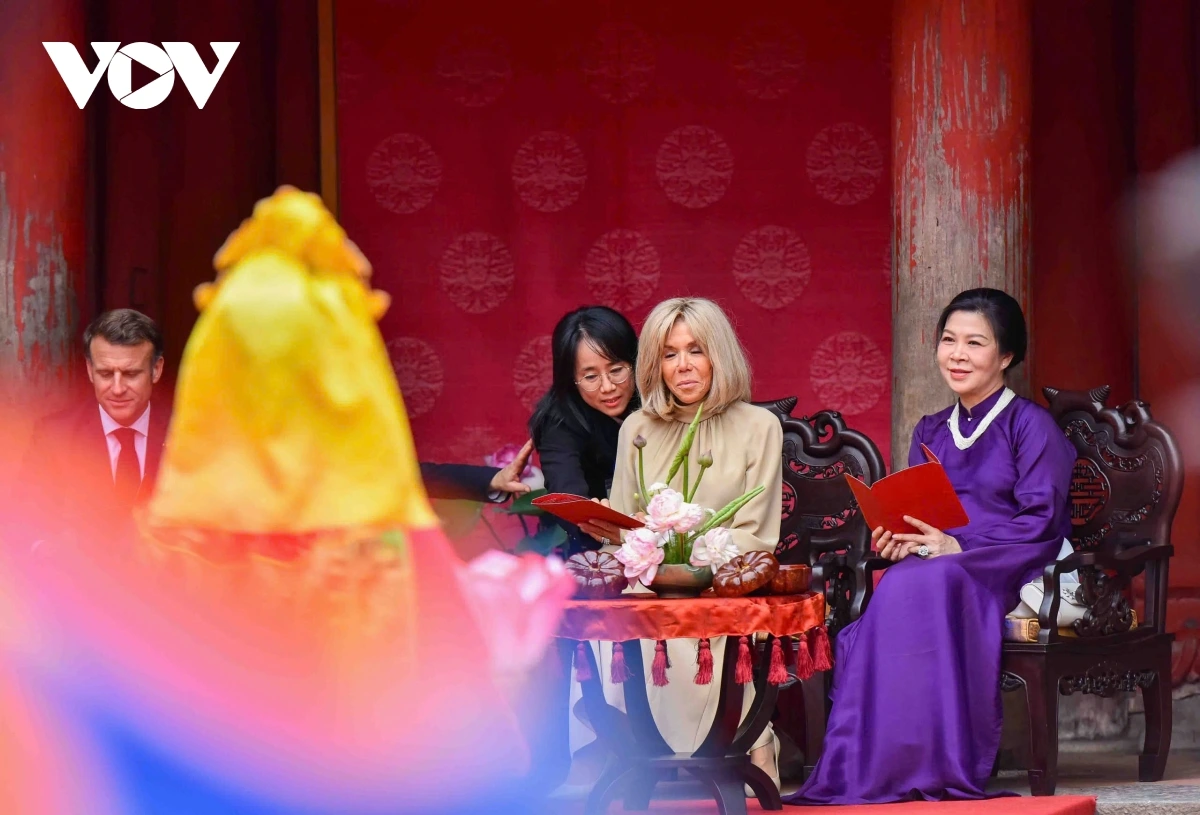 | Tổng Bí thư Tô Lâm và Phu nhân cùng Tổng thống Pháp Emmanuel Macron và Phu nhân nghe giới thiệu về Khuê Văn Các, xem múa rối nước bên cạnh giếng Thiền Quang, xem Nhã nhạc Cung đình Huế tại sân chính Văn Miếu và thưởng thức nhạc nhẹ, dân ca mang đậm bản sắc văn hóa Việt Nam. |