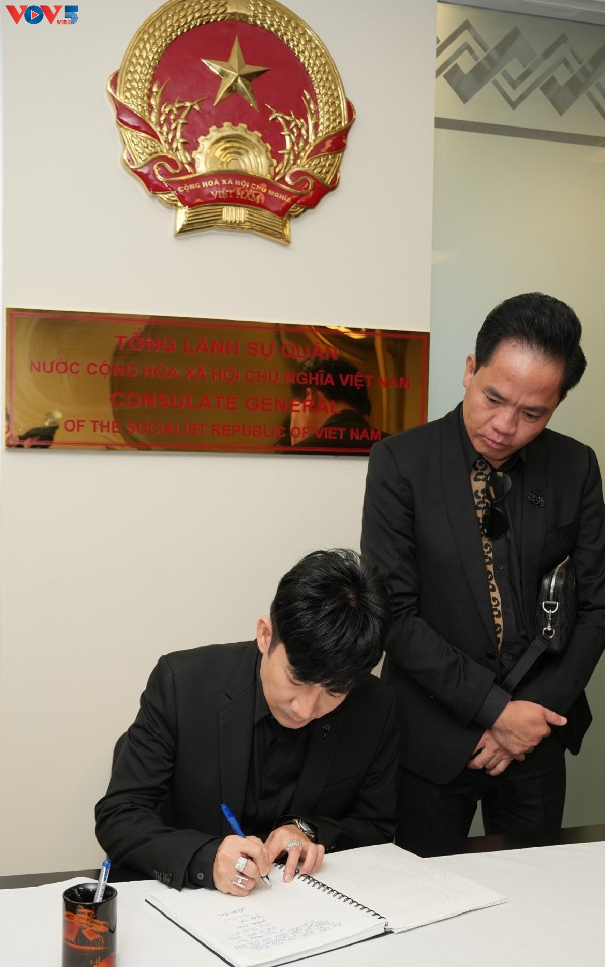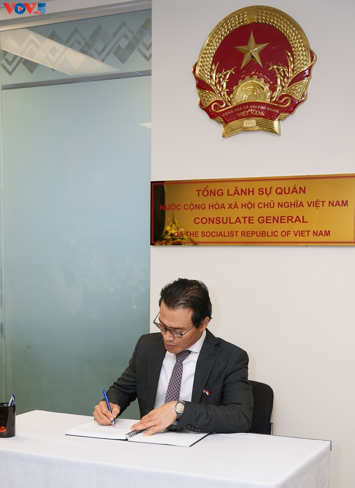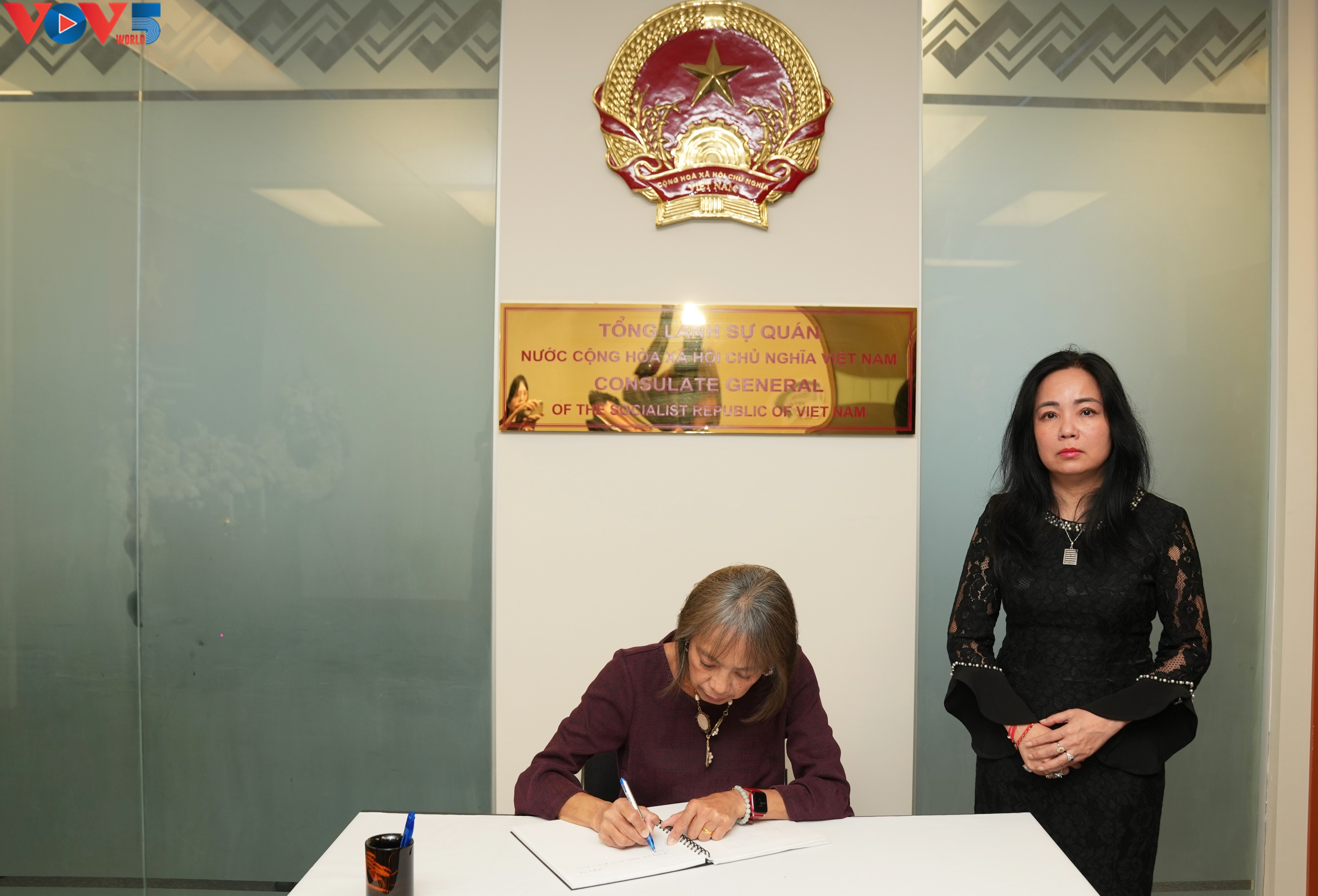 Tổng lãnh sự Phan Kiều Thu (giữa) ghi sổ tang. |