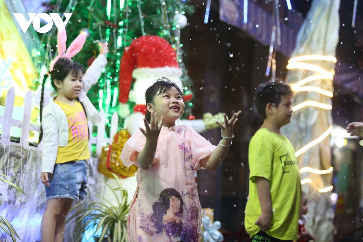 Ngoài những tiểu cảnh truyền thống, một số nơi còn đầu tư máy phun tuyết… tạo nên không khí tuyệt đẹp cho mùa Giáng sinh.