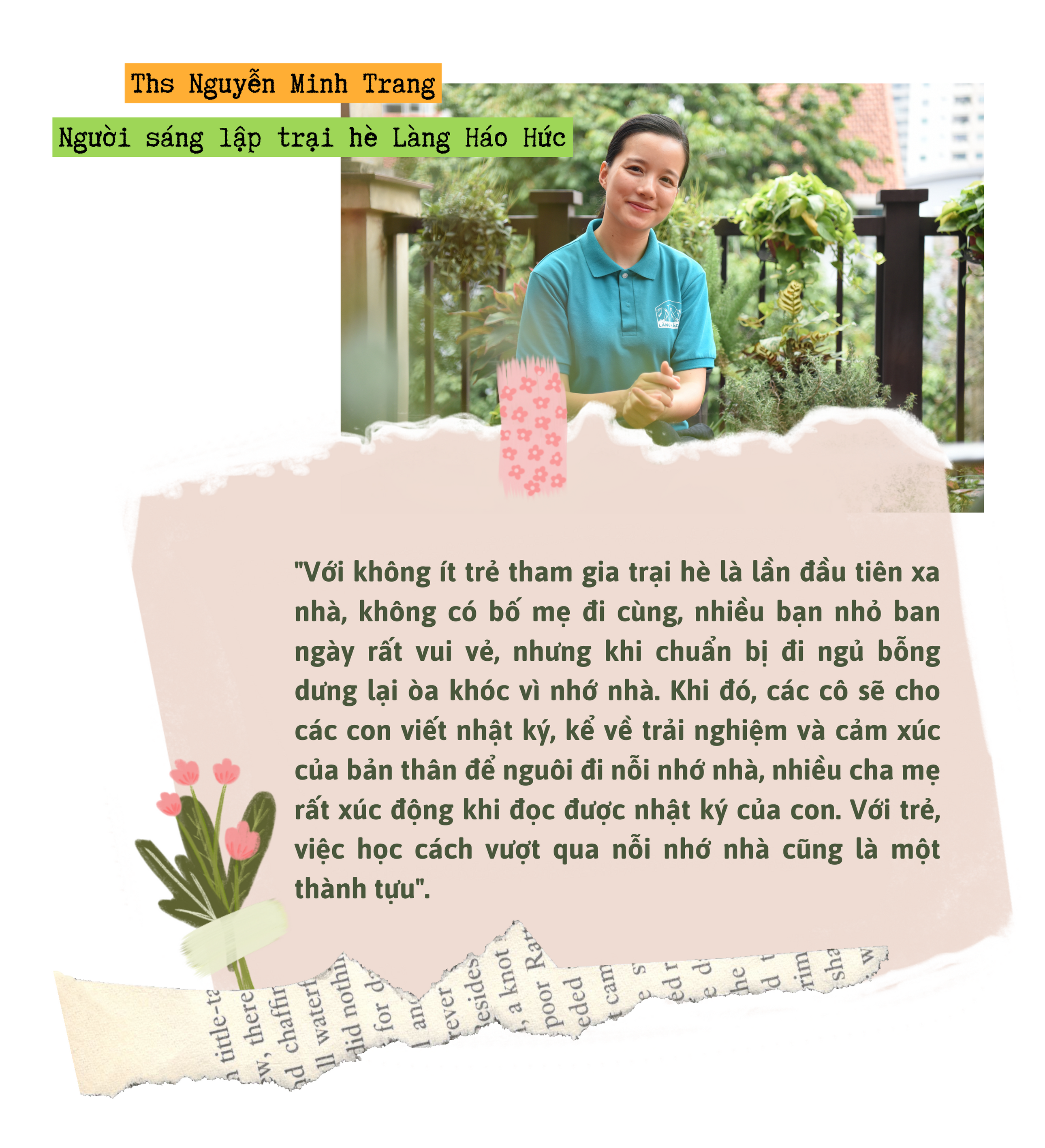 “Với không ít trẻ tham gia trại hè là lần đầu tiên xa nhà, không có bố mẹ đi cùng, nhiều bạn nhỏ ban ngày rất vui vẻ, nhưng khi chuẩn bị đi ngủ bỗng dưng lại òa khóc vì nhớ nhà. Khi đó, các cô sẽ cho các con viết nhật ký, kể về trải nghiệm và cảm xúc của bản thân để nguôi đi nỗi nhớ nhà, nhiều cha mẹ rất xúc động khi đọc được nhật ký của con. Với trẻ, việc học cách vượt qua nỗi nhớ nhà cũng là một thành tựu”.