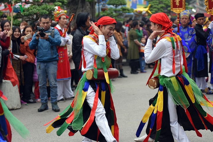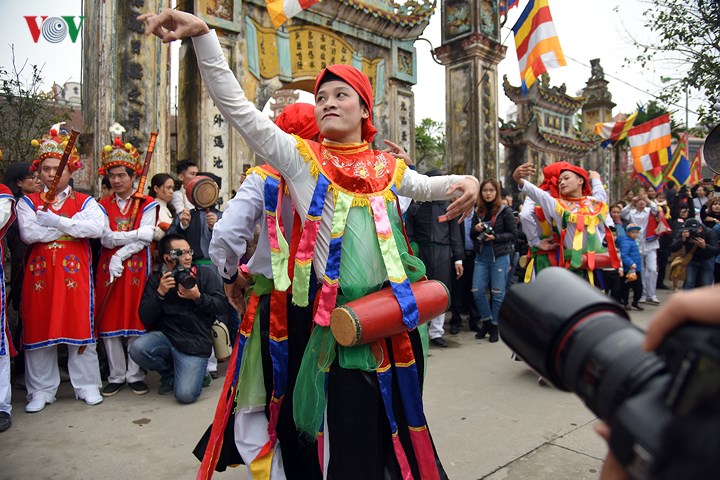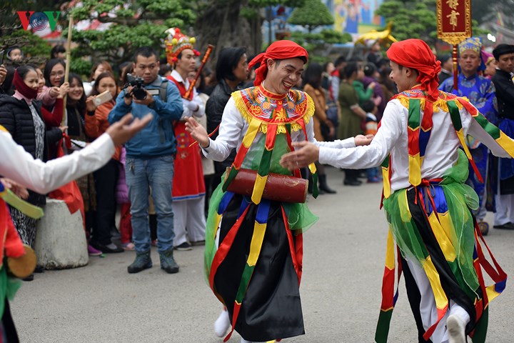 | Điểm nhấn của lễ hội và được nhiều người ưa thích nhất là trò múa "con đĩ đánh bồng”. Đây là một điệu múa cổ do các chàng trai giả gái biểu diễn. |