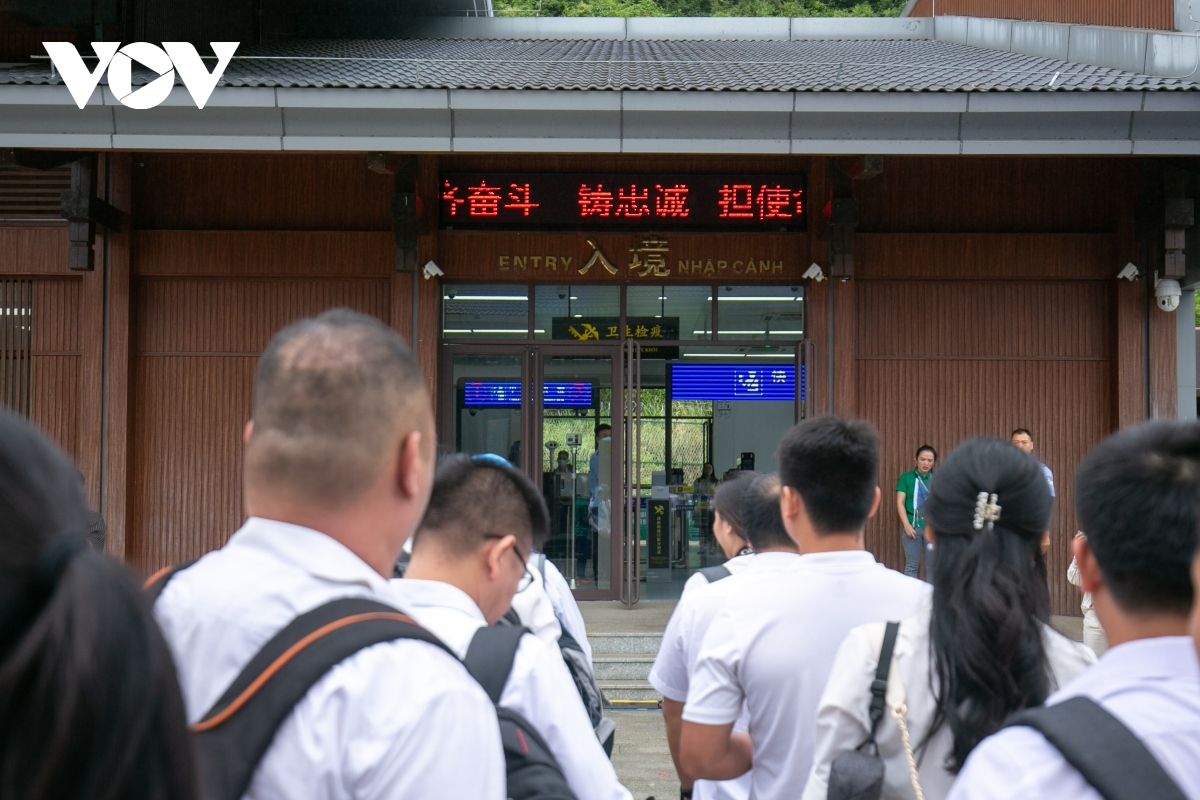 Đoàn khách đầu tiên của Việt Nam chuẩn bị làm thủ tục thông quan. Do có sự chuẩn bị chu đáo, các thủ tục xuất nhập cảnh đã được lực lượng Hải quan, Biên phòng 2 nước thực hiện nhanh chóng, chu đáo và đảm bảo an toàn, trật tự. |