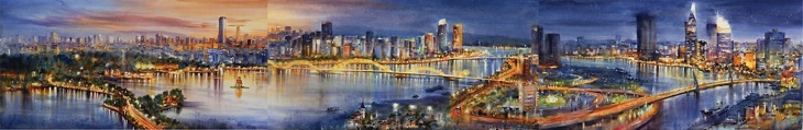 Tác phẩm mới nhất của họa sĩ Đoàn Cao Quốc được thực hiện trong 3 tháng, gồm 3 bức tranh có size 2m x 6m ghép lại, là 3 bức tranh riêng biệt vẽ khung cảnh đặc trưng của 3 thành phố lớn ở Việt Nam: Hà Nội - Đà Nẵng - TP. Hồ Chí Minh. Thú vị nhất là khi ghép 3 tranh lại với nhau, có một sự kết nối tự nhiên liền mạch đầy thi vị của hồ Hoàn Kiếm - sông Hàn - sông Sài Gòn, tạo thành một đô thị rộng lớn như một “siêu” đô thị phồn vinh, rực rỡ.