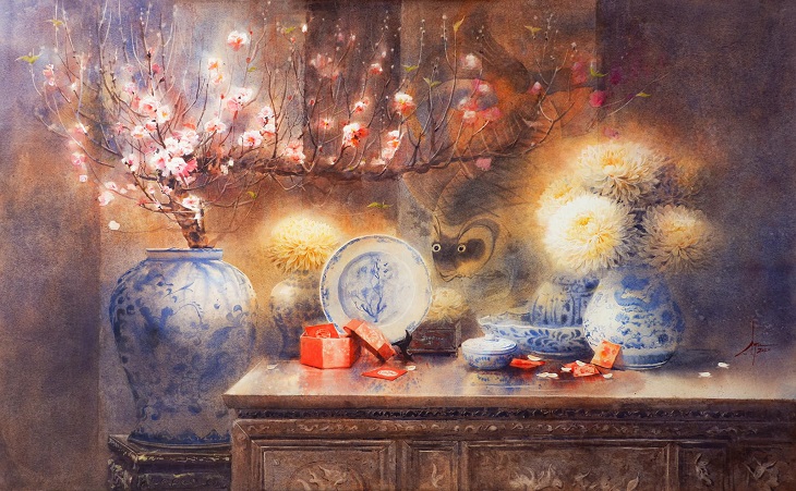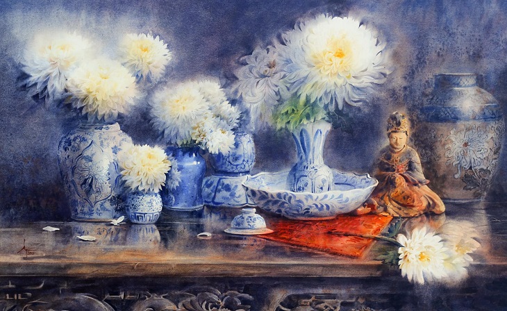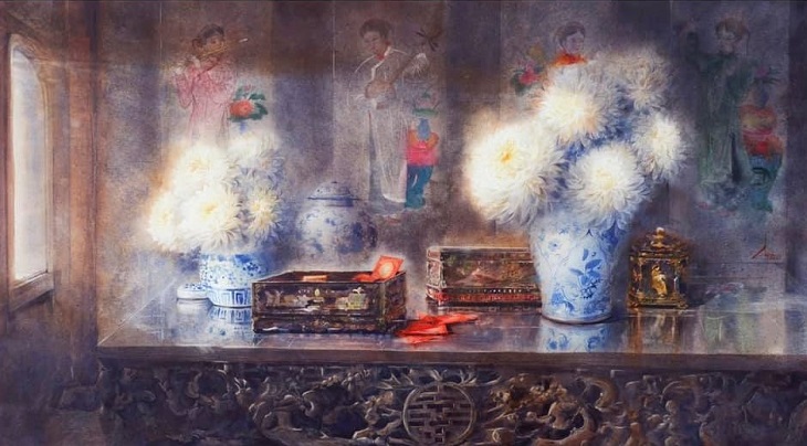 Và nếu tinh ý chút, ngắm tranh của Quốc, nhận ra anh rất có ý thức về những tinh hoa văn hóa truyền thống Việt, đưa vào tác phẩm của mình một cách tinh tế. Như những bình hoa trong tranh của Quốc, rất dễ nhận ra là những “dòng” gốm sứ Việt danh tiếng, hay những “tĩnh vật” điểm xuyết xung quanh bình hoa đều mang dáng dấp của một nền mỹ thuật Việt tinh xảo.