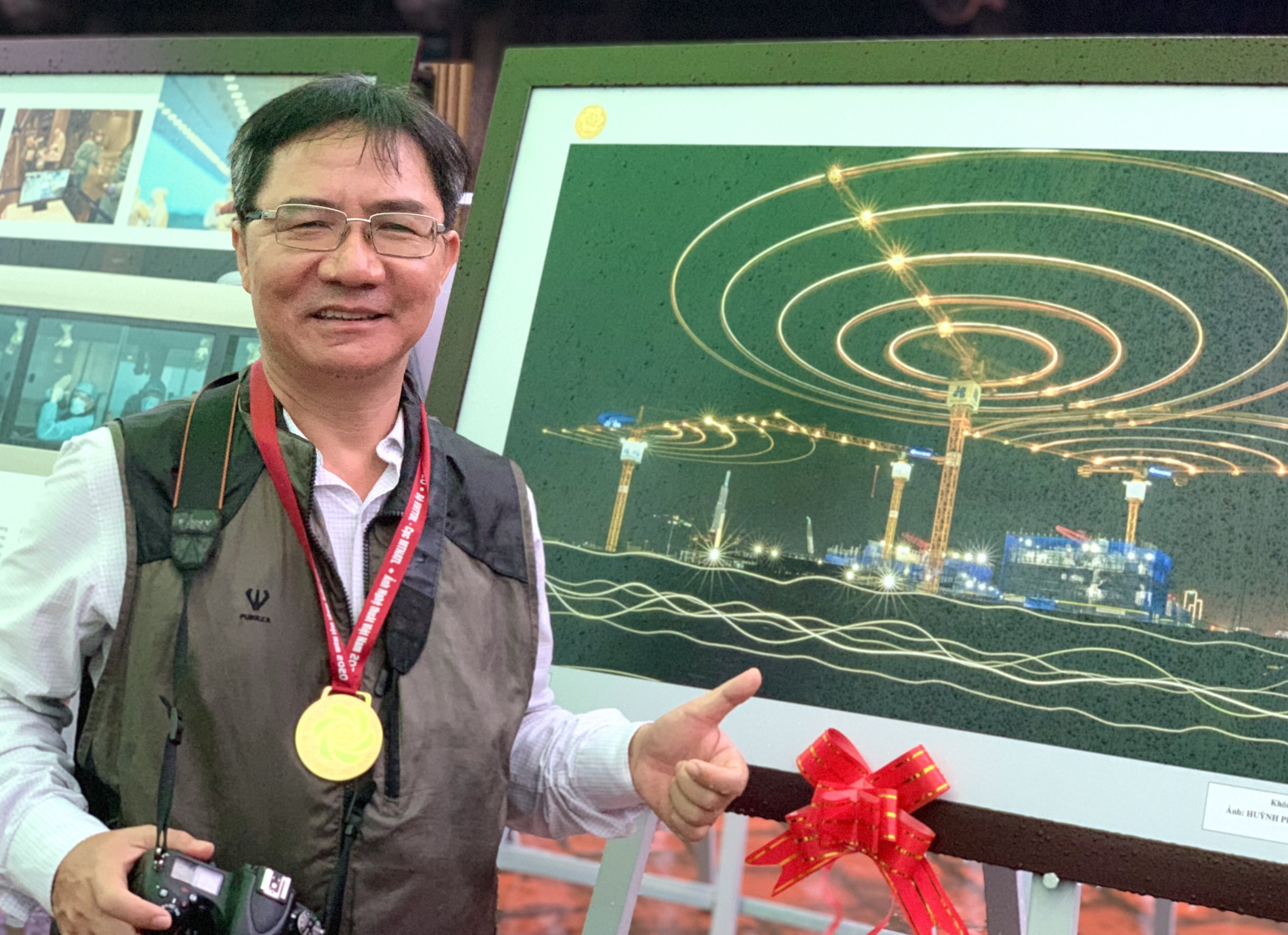 Tác giả Huỳnh Phạm Anh Dũng chụp ảnh bên cạnh tác phẩm "Không ngừng phát triển" mới đoạt huy chương vàng của mình