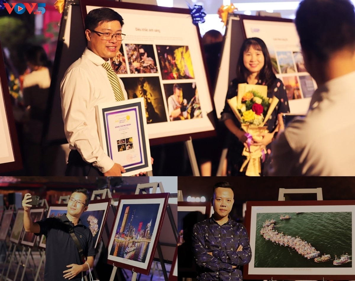 Các nghệ sĩ nhiếp ảnh cùng tác phẩm của mình tại triển lãm. |