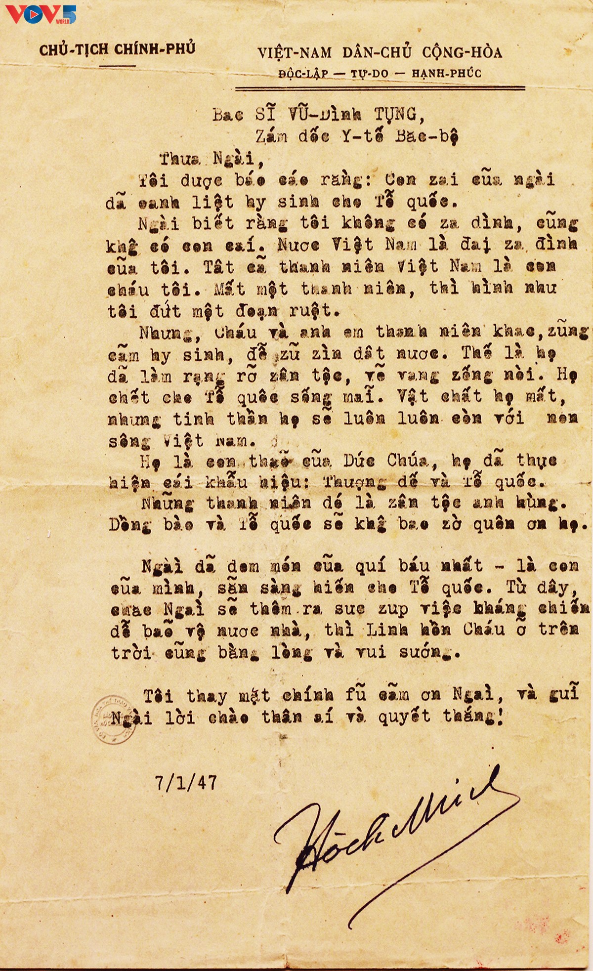 Bức thư xúc động của Chủ tịch Hồ Chí Minh gửi lời chia buồn với bác sĩ Vũ Đình Tụng về sự hy sinh oanh liệt của con trai ông. |