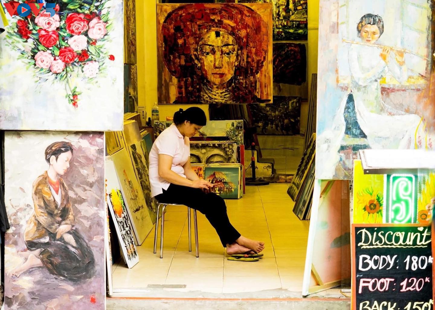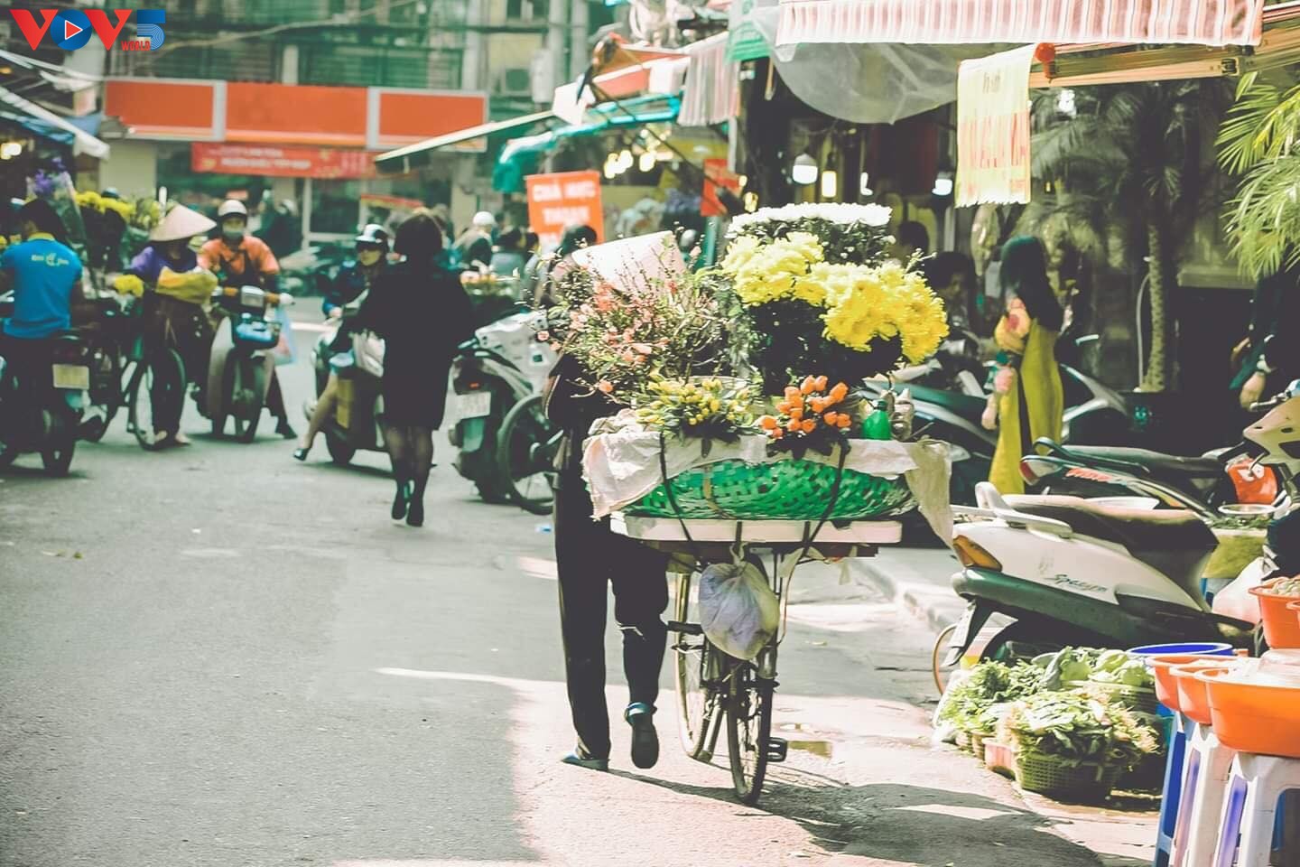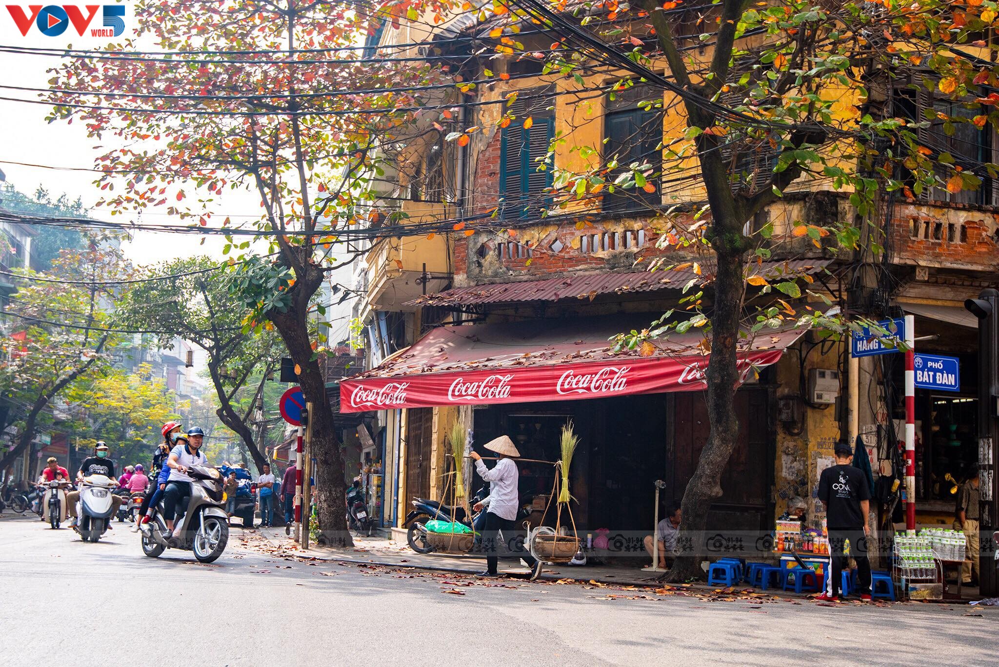 Cuộc sống thường ngày ở Hà Nội đầy dung dị cũng được thể hiện qua những quán nước, cửa hàng hiện đại hoặc truyền thống, những gánh hàng rong, xe hoa di động, người phu khuân vác...
