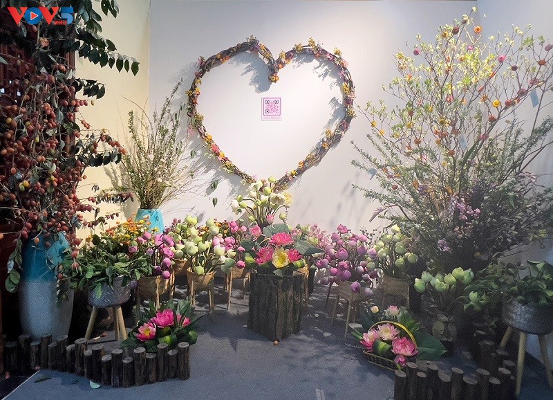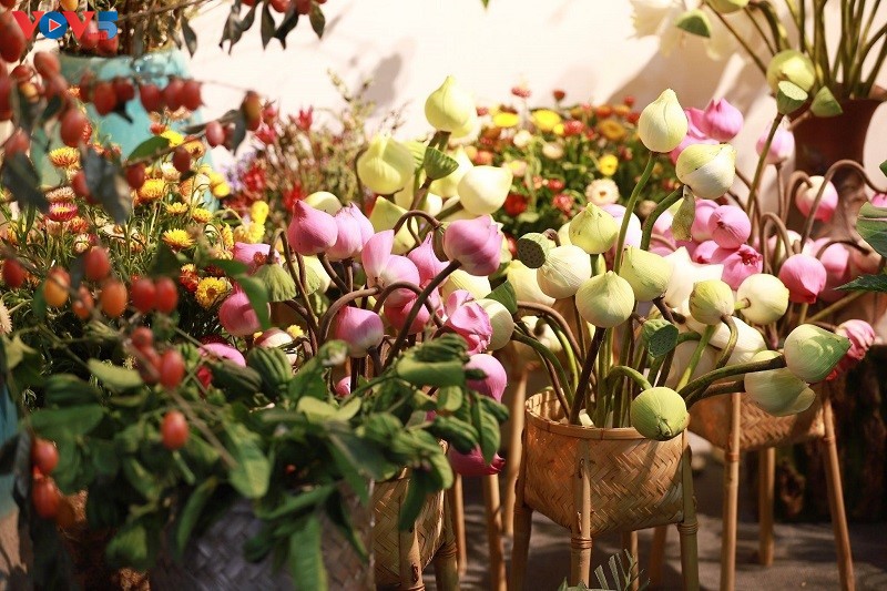 Xen lẫn những đóa Sen tươi là những giỏ hoa Sen được họa sĩ Kim Đức cắt tỉa từ củ quả. |