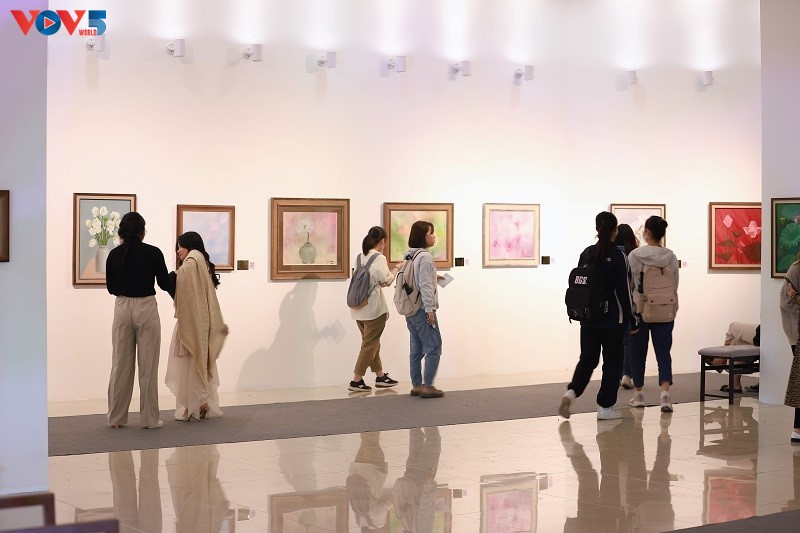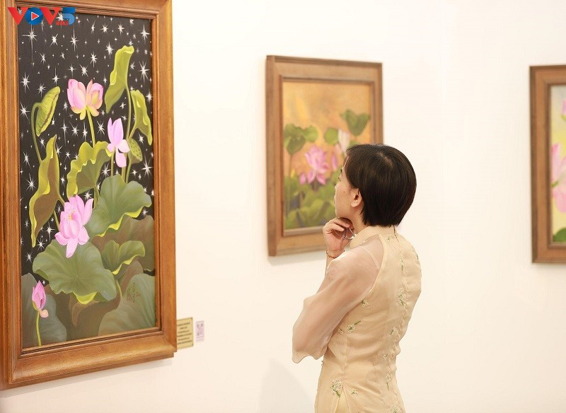 Với không gian nghệ thuật ngập tràn hoa Sen, triển lãm thu hút nhiều người đến thưởng lãm. |