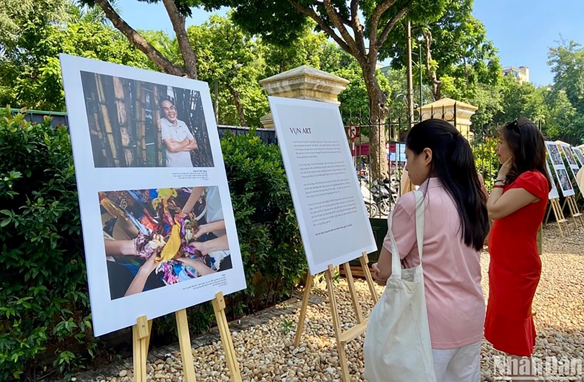 “Triển lãm quy tụ nhiều loại hình nghệ thuật. Mỗi một loại hình đều có một ngôn ngữ riêng. Và khi truyền tải cùng một chủ đề, chúng sẽ cộng hưởng với nhau, lan tỏa thông điệp sống xanh thật rộng rãi. Theo tôi, chỉ khi thông qua cái đẹp, thông qua nghệ thuật, ý nghĩa về sống xanh mới truyền thẳng đến trái tim chúng ta”, họa sĩ Lê Thiết Cương cho biết. (Trong ảnh: Công chúng tham quan triển lãm. Ảnh: Báo Nhân Dân) |