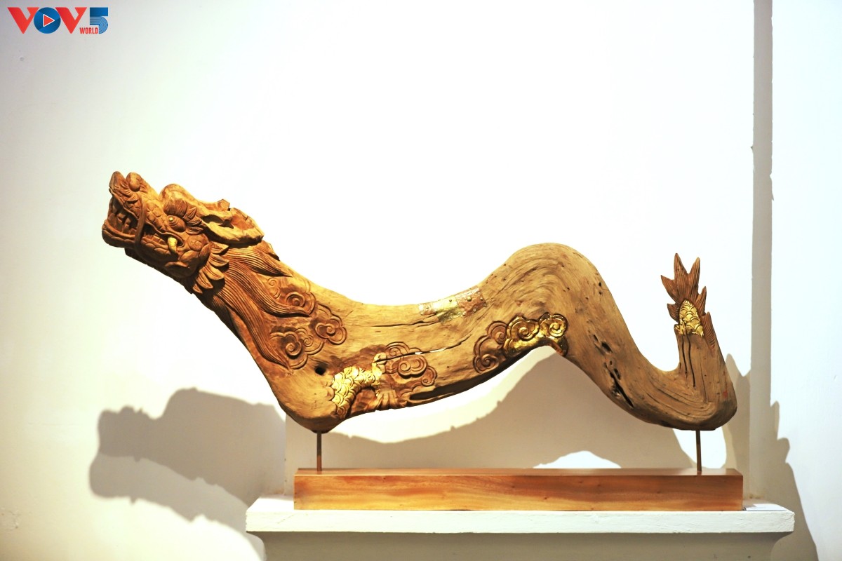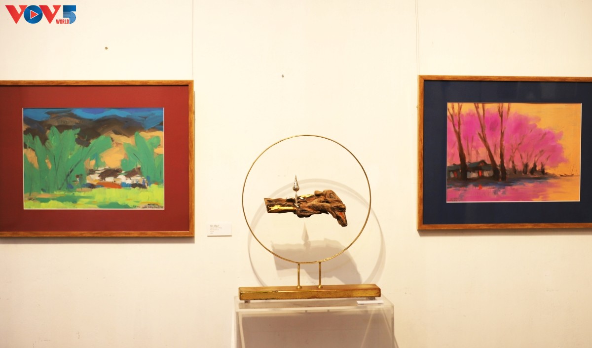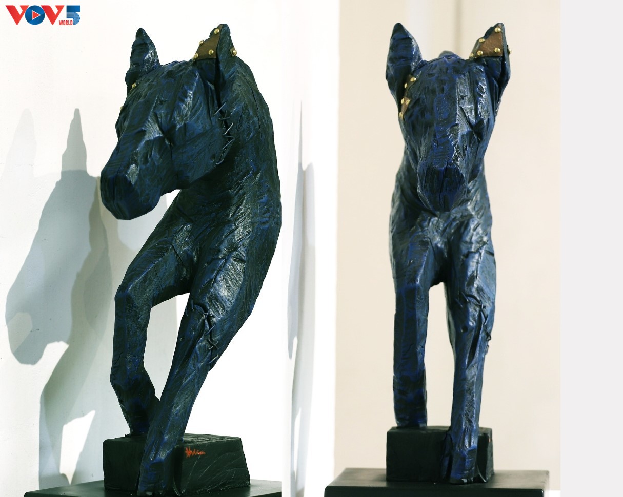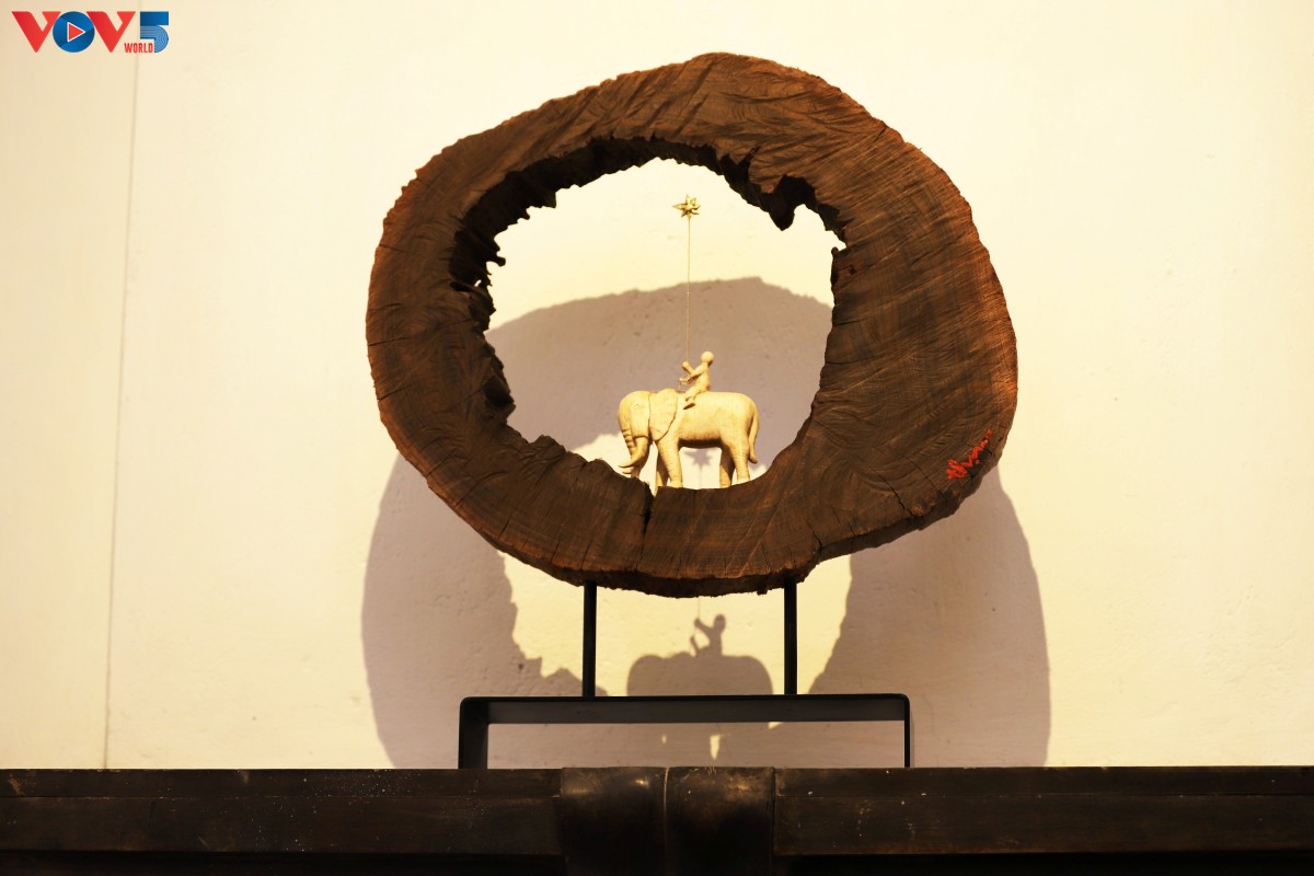 Một trong số tác phẩm nổi bật tại triển lãm là tác phẩm điêu khắc từ chất liệu đặc biệt - củi lũ (những xác củi từ thượng nguồn trôi về theo dòng lũ) - của điêu khắc gia Lê Ngọc Thuận. |