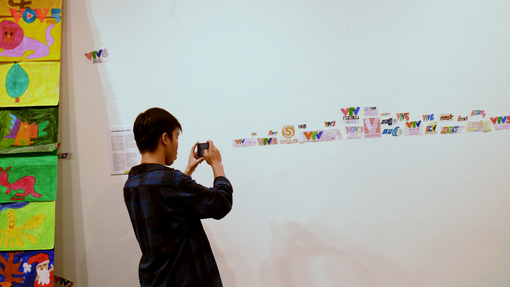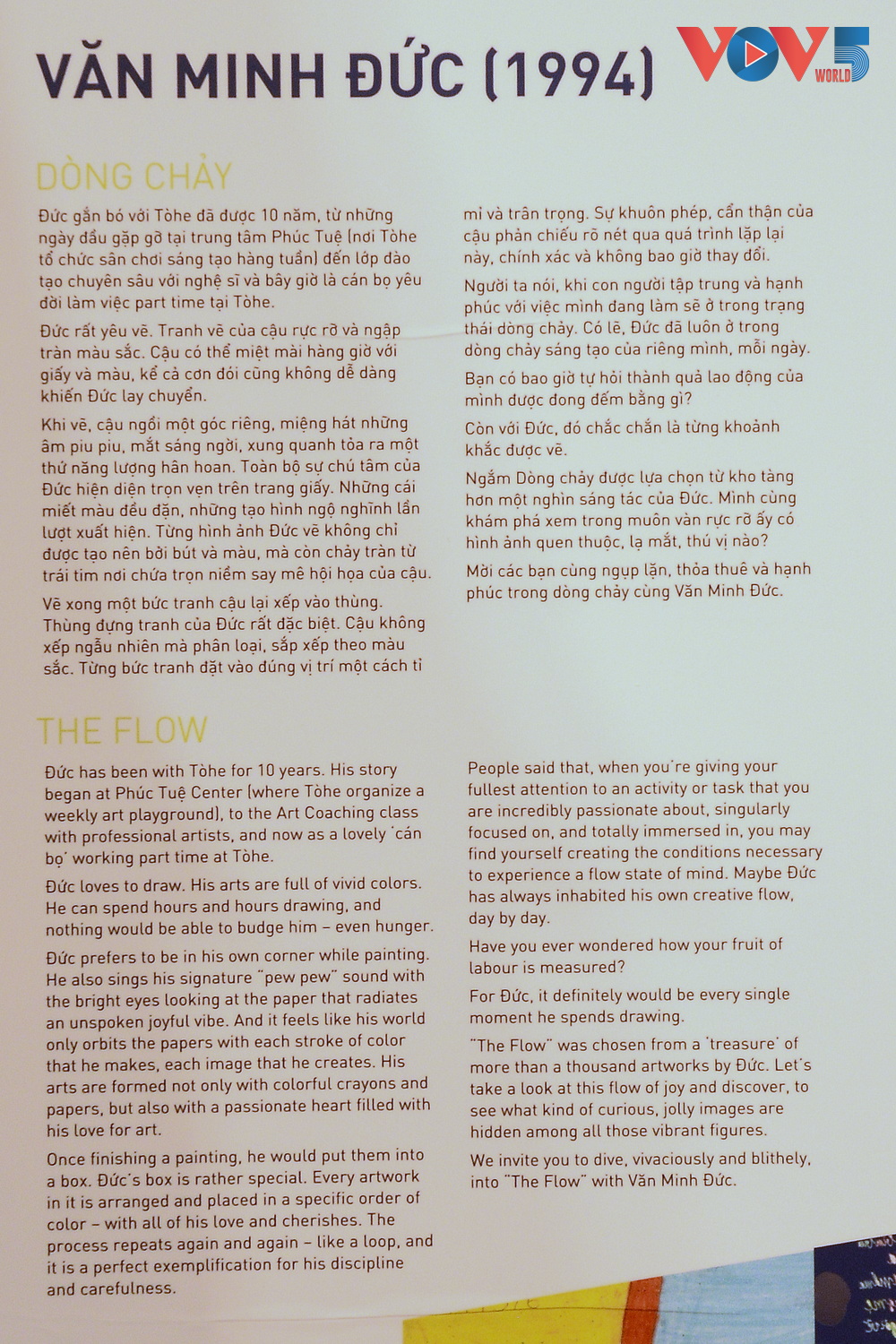 | Chiếm vị trí không gian thu hút công chúng nhất là tác phẩm "Dòng chảy" của Văn Minh Đức, đây là tập hợp 168 bức tranh được Đức chọn từ kho tàng hơn 1000 tác phẩm của mình để ghép lại thành một dòng chảy đầy màu sắc đổ từ trên xuống phía người xem. |