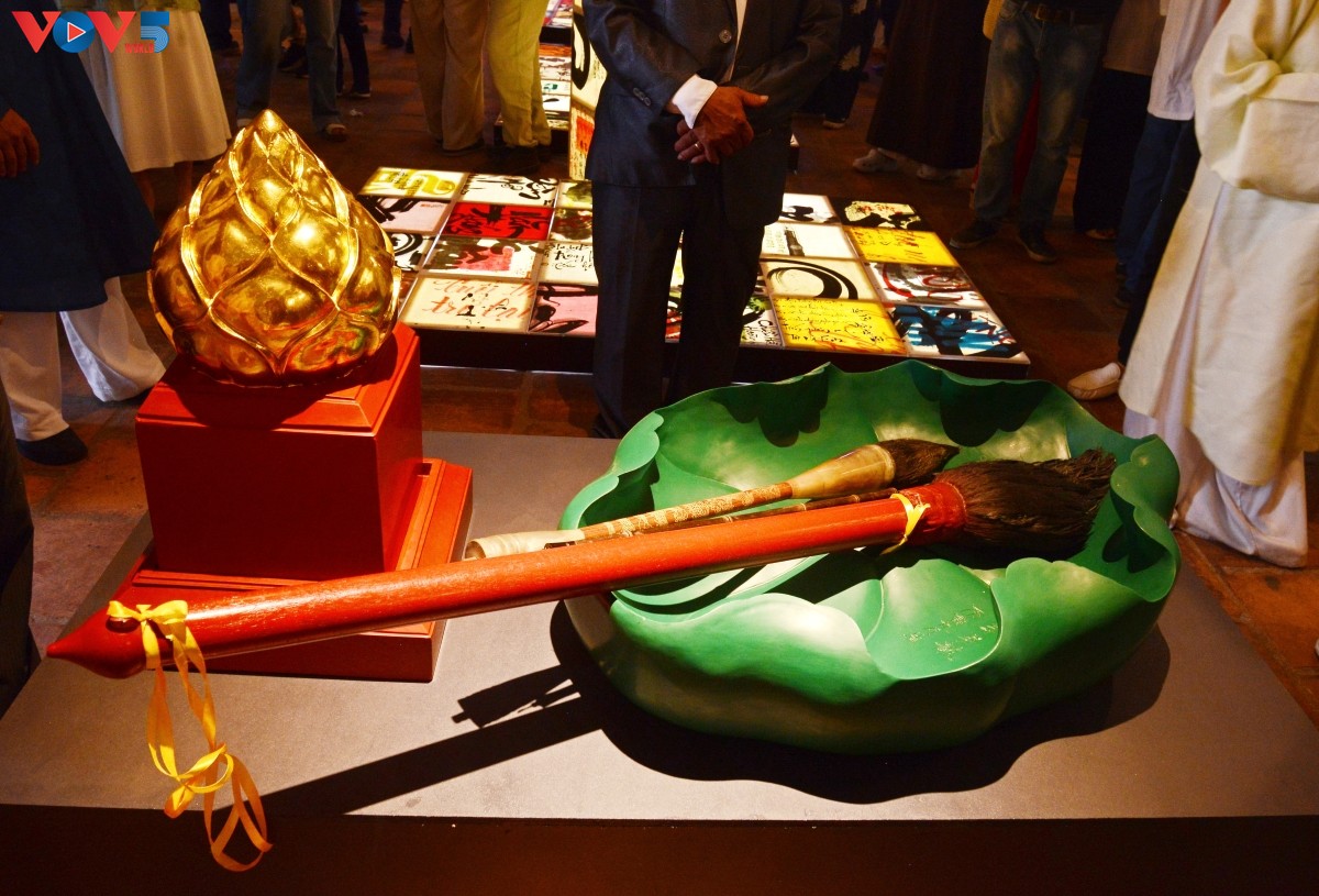 Nổi bật là tác phẩm điêu khắc sơn thếp nghiên mực hình lá sen, bút lông cỡ lớn, cùng với con triện lớn có điêu khắc hình búp sen trên đầu và mặt triện được khắc 4 chữ triện Thăng Long Văn Miếu (Văn Miếu ở Thăng Long) vừa là chủ đề của triển lãm, vừa là hàm ý hướng tới Thăng Long - Hà Nội lại cũng vừa là sự khẳng định vị trí của Văn Miếu với bút-nghiên nơi khơi nguồn đạo học. |