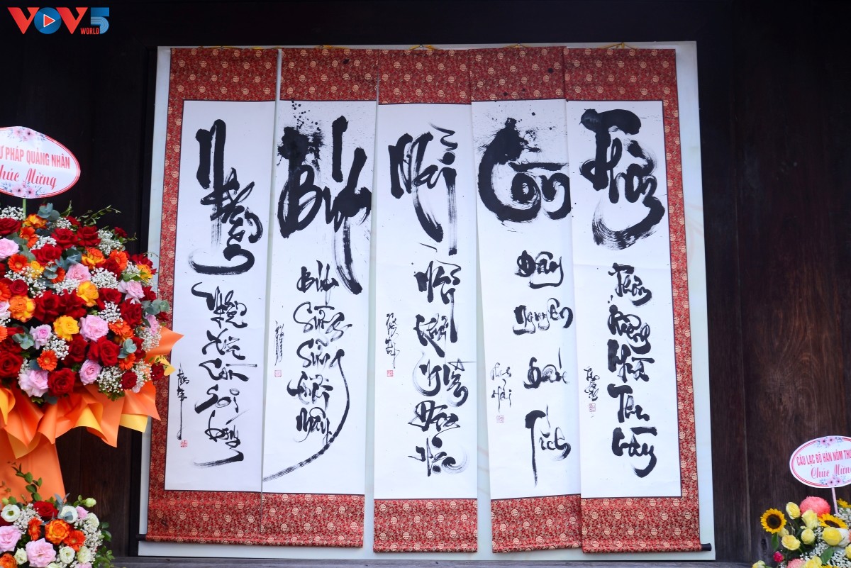 Mỗi thư pháp gia viết lên một câu thơ do giám tuyển của triển lãm là thư pháp gia, triện khắc gia Xuân Như (Vũ Thanh Tùng) sáng tác: “Nghiên xưa còn soi bóng; Bút sừng sững trời mây; Mãi khơi nguồn đạo học; Còn đây nguyên dấu tích; Thơm riêng nhà thu này”. |