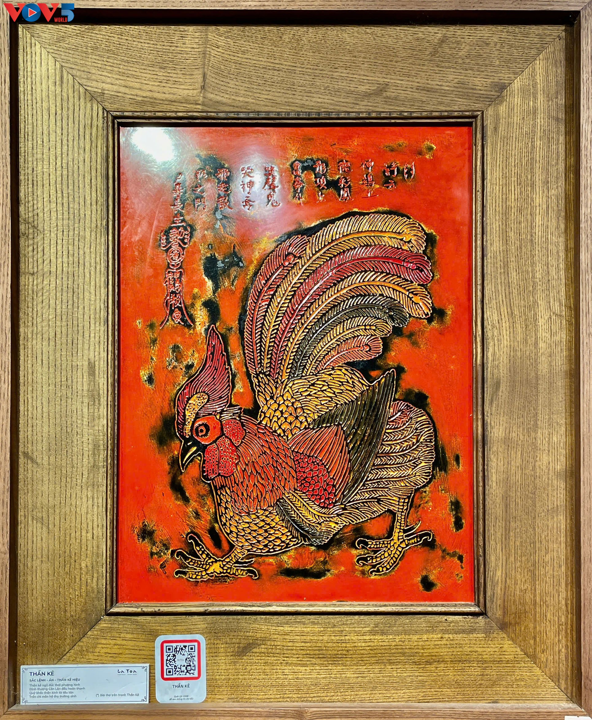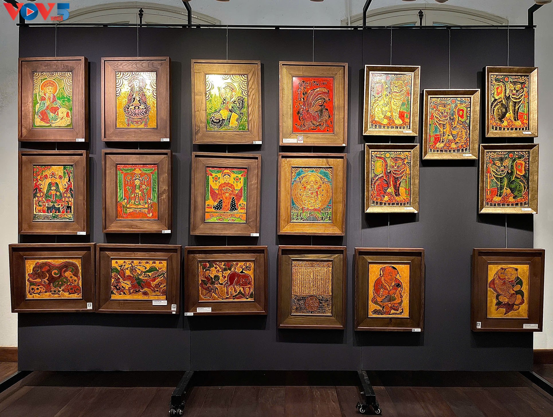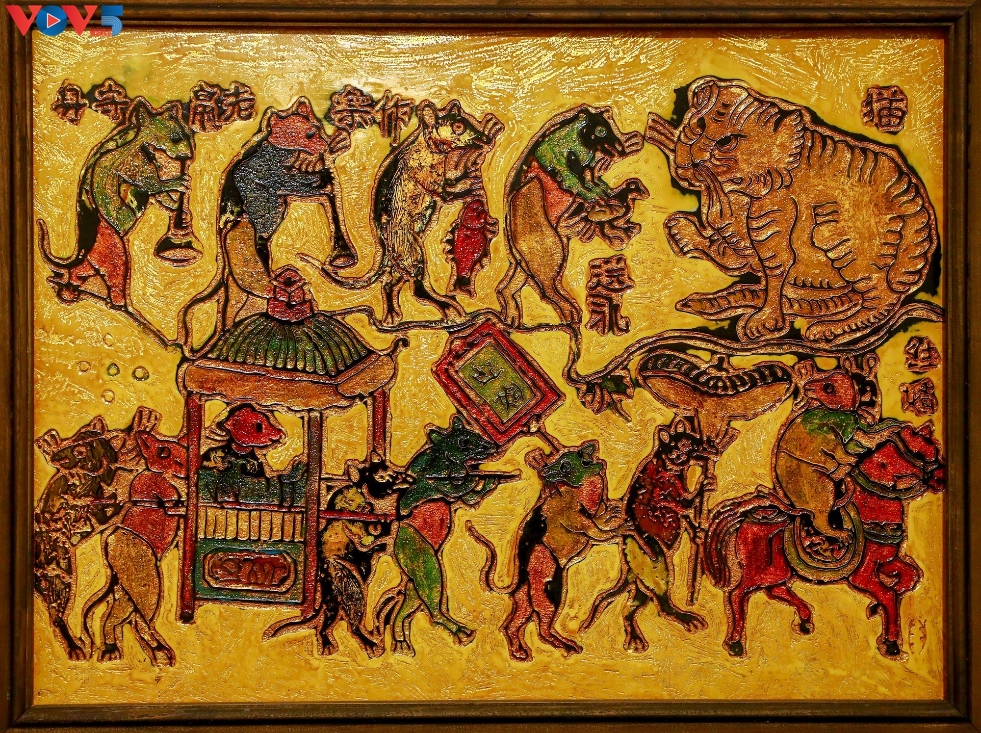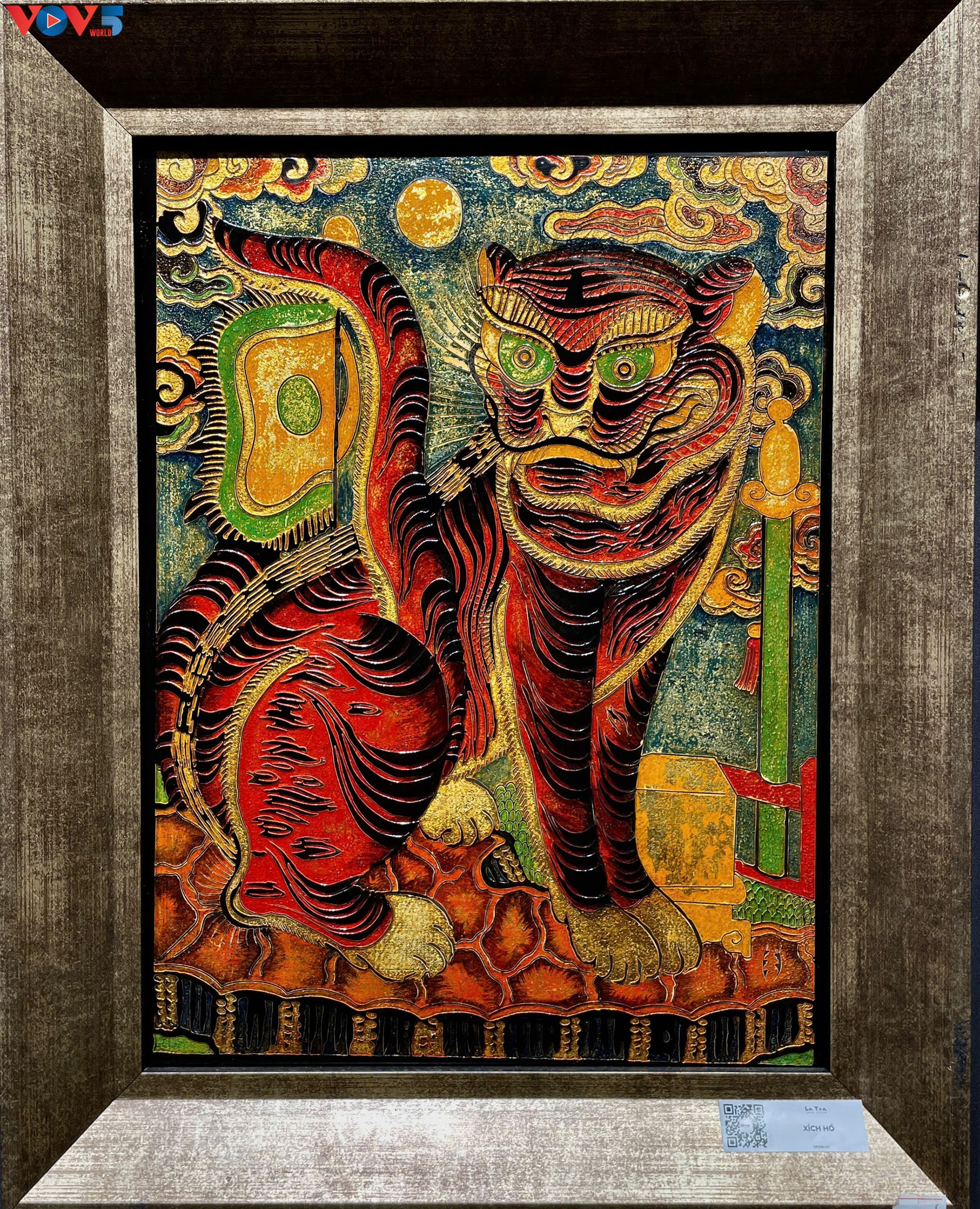 | Triển lãm trưng bày trên 60 bức tranh với đề tài tranh dân gian Hàng Trống - Đông Hồ - Kim Hoàng quen thuộc trên cơ sở “tái tạo” kết hợp kỹ thuật tranh sơn mài với tranh sơn khắc trên một chất liệu mới: vóc (tấm gỗ dùng để khắc tranh), của các họa sĩ như Nguyễn Thái Học, Trần Thiệu Nam, Nguyễn Văn Phúc, Lương Minh Hoà… Ảnh: Hà Phương/VOV5. |