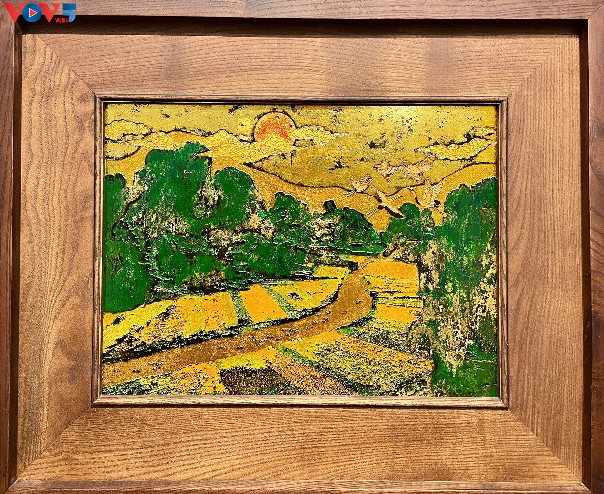 | Theo ông Phạm Ngọc Long, Chủ tịch Latoa Indochine: "Mỗi bức tranh dân gian đều phản ánh sâu sắc đời sống vật chất và tinh thần của con người trong xã hội xưa. Qua tài sáng tạo và biết bao tâm huyết của các họa sĩ, những hình ảnh trong tranh sơn mài khắc đều được thể hiện tỉ mỉ, sắc nét, có chiều sâu. Các họa sĩ sẽ đưa người xem quay ngược về quá khứ, để thấy mạch chảy của di sản từ truyền thống đến hiện đại". Ảnh: Hà Phương/VOV5. |