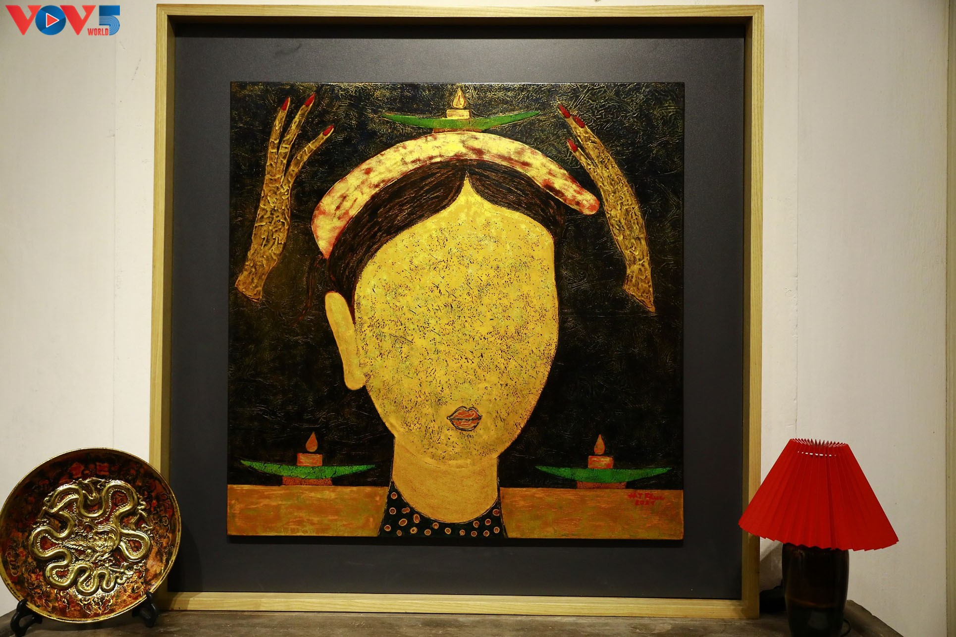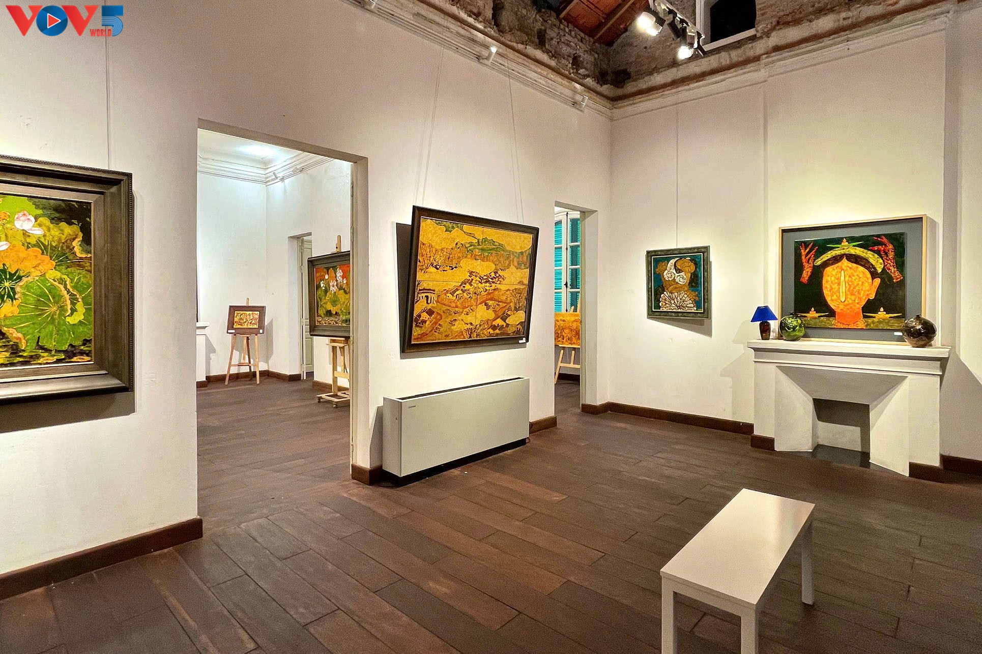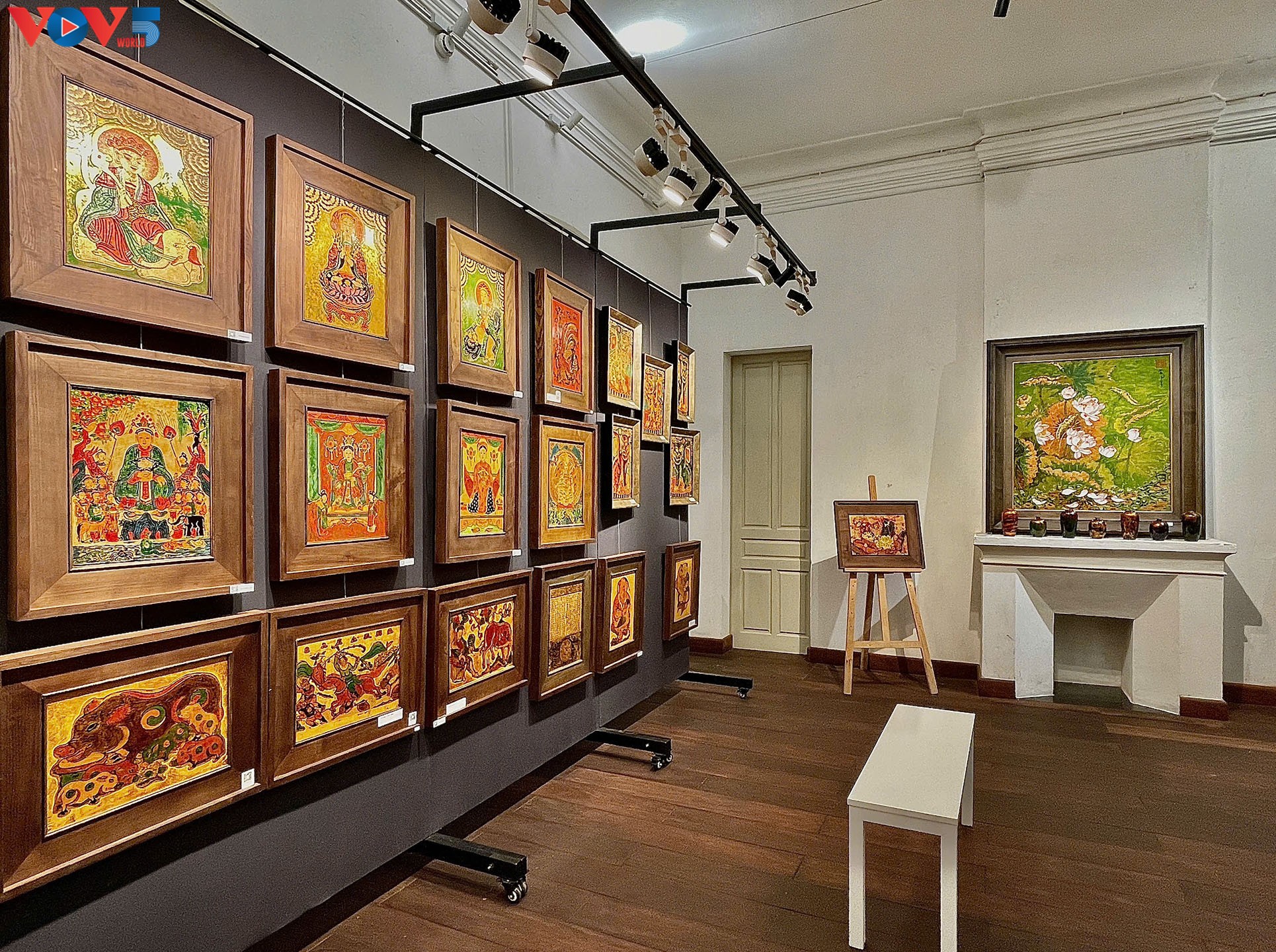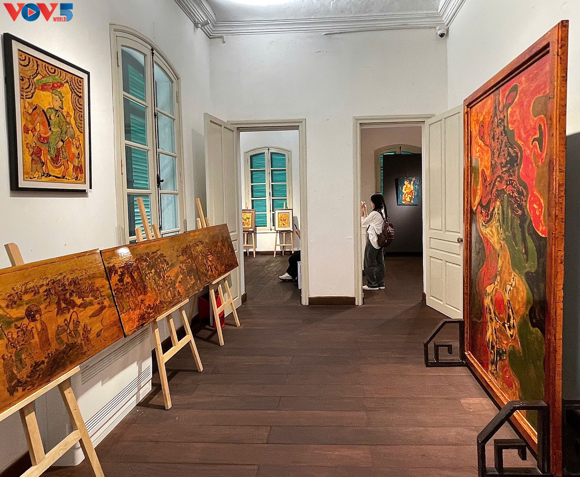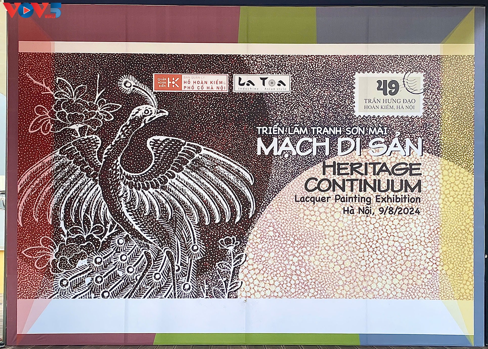 | Triển lãm tranh “Mạch di sản” mở cửa tham quan tự do từ 9h - 17h các ngày từ thứ Ba đến Chủ nhật hàng tuần, tại Tầng 1 và tầng 2 của Trung tâm Giao lưu văn hoá khu phố cũ Hà Nội (số 49 Trần Hưng Đạo, phường Hàng Bài, quận Hoàn Kiếm). Trong thời gian diễn ra triển lãm, các tác giả sẽ tổ chức các hoạt động trải nghiệm sơn mài khắc và hoạ màu dân gian để công chúng hiểu thêm về nghệ thuật sơn mài truyền thống của Việt Nam. Ảnh: Hà Phương/VOV5./. |