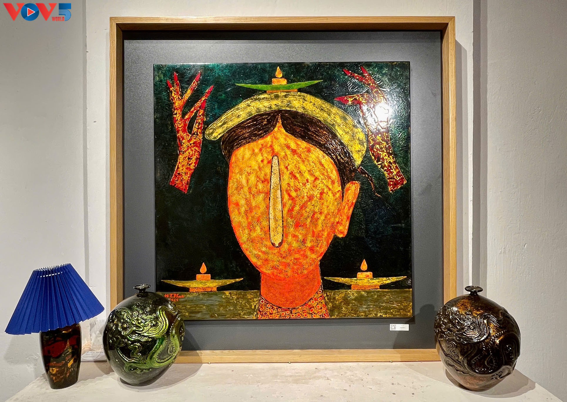 | Không chỉ trưng bày tác phẩm tranh dân gian, nhóm họa sỹ Trần Thiệu Nam, Nguyễn Văn Phúc, Nguyễn Thái Học, Lương Minh Hoà… còn giới thiệu thêm các đề tài về sen, múa đèn, phong cảnh, nhân vật… bằng chất liệu sơn mài, thể hiện tình yêu và đam mê nghệ thuật. Ảnh: Hà Phương/VOV5. |