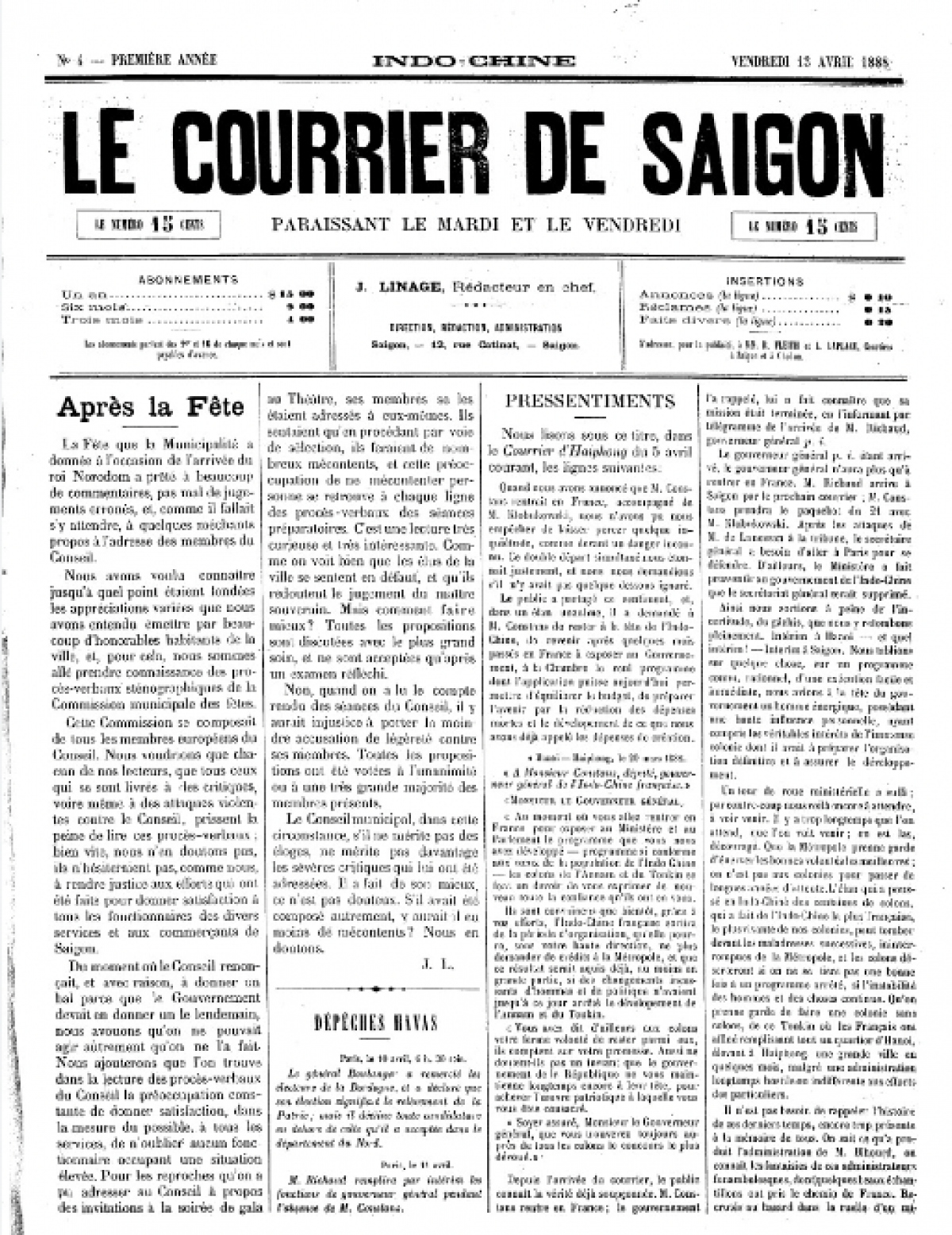 | Tờ Le Courrier de Saigon - Tây Cống nhựt báo. (Nguồn: Thư viện Quốc gia Pháp) |