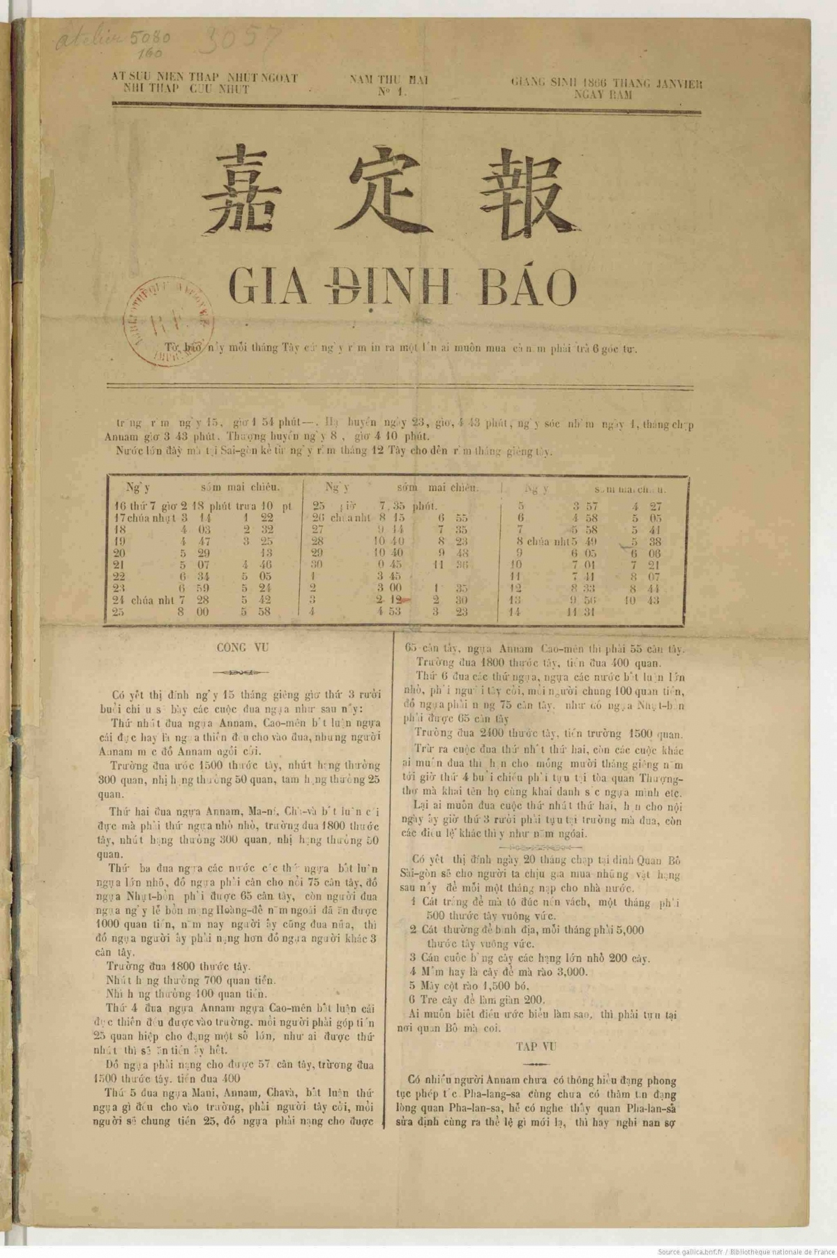 | Tờ Gia Định báo chữ Quốc ngữ ra đời ngày 15/4/1865 tại Sài Gòn – Gia Định do Trương Vĩnh Ký sáng lập kiêm Chủ nhiệm (Giám đốc), Huỳnh Tịnh Của làm Chủ bút, được các nhà sử học ghi nhận là đứa con đầu lòng của báo chí Việt Nam. (Nguồn: Thư viện Quốc gia Pháp) |