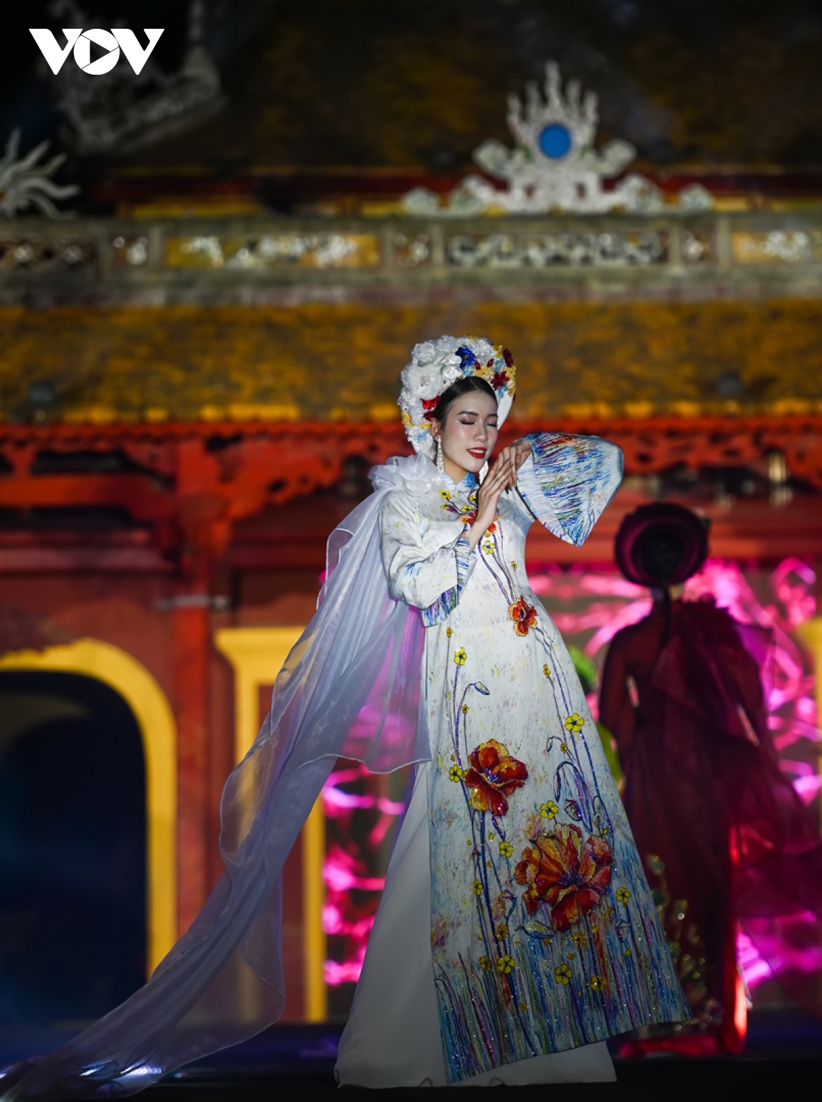 Bộ sưu tập Sắc Hoa Hội Tụ của NTK Nguyễn Lan Vy như phủ một làng hương thơm tràn ngập bốn mùa hoa nở của TP Huế dịu dàng nghiêng bóng với nét đẹp Cố Đô mĩ miều, thanh thoát, khiến những ai đã đến Huế luôn đêm lòng bâng khuâng thầm thương nhớ Huế. |
