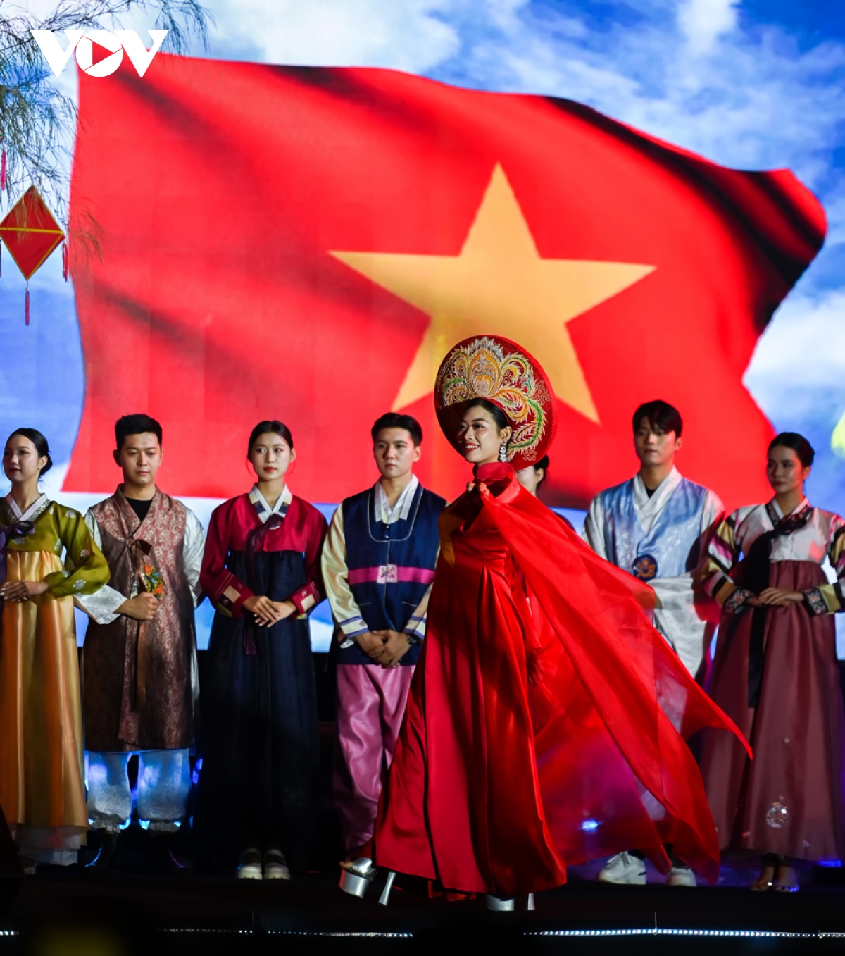 Ý tưởng tuyệt vời khi đưa 2 Quốc kỳ của hai nước Việt Nam - Hàn Quốc lên tà áo dài và sự hoà quyện của 2 người mẫu trên sàn diễn thể hiện sự giao lưu văn hóa hơn nữa giữa Việt Nam và Hàn Quốc – hai nước vốn có nhiều nét tương đồng về văn hóa và lịch sử. |