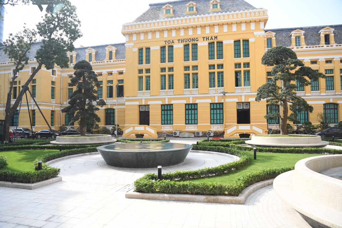 Khu vực vườn Công lý nhìn vào tòa nhà Pháp cổ - nơi làm việc của cán bộ, công chức Tòa án nhân dân tối cao (đã được Bộ Văn hóa - Thể thao và Du lịch xếp hạng là Di tích Kiến trúc - Nghệ thuật cấp Quốc gia ngày 13/12/2019)