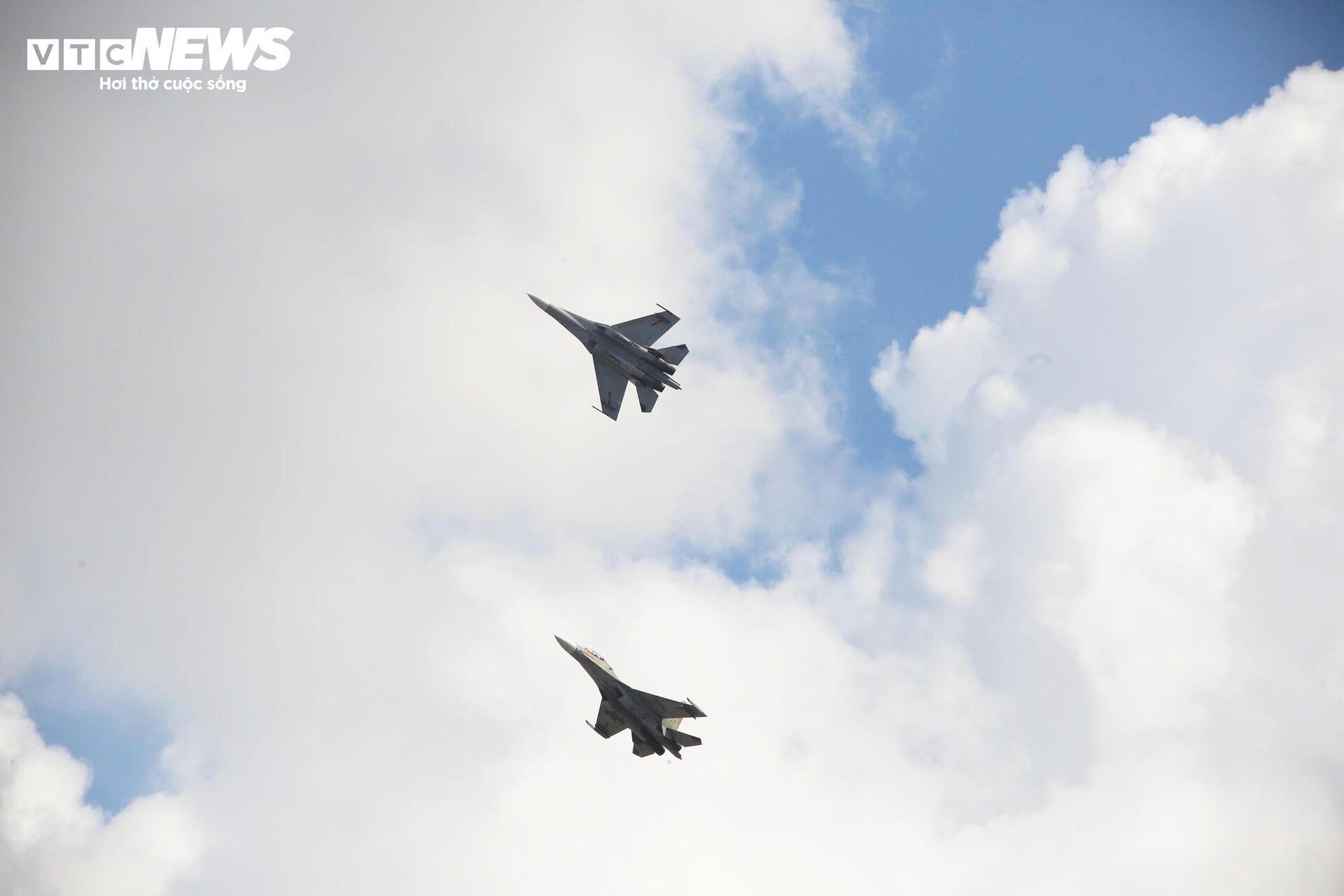 | Các chiến đấu cơ Su-30 bay lướt ngang bầu trời trung tâm, tạo nên tiếng rít xé gió đầy uy lực. Trong khi đó, tiêm kích Yak-130 lướt qua như "xé toạc" không trung. |