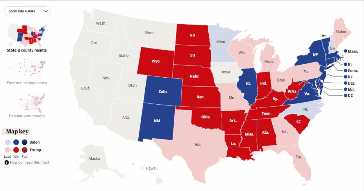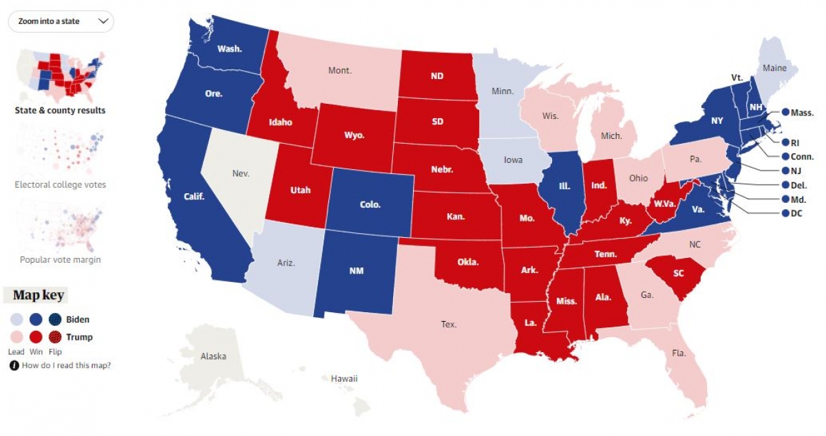Bản đồ bầu cử Mỹ tính đến 11h20 sáng 4/11 (theo giờ Việt Nam)