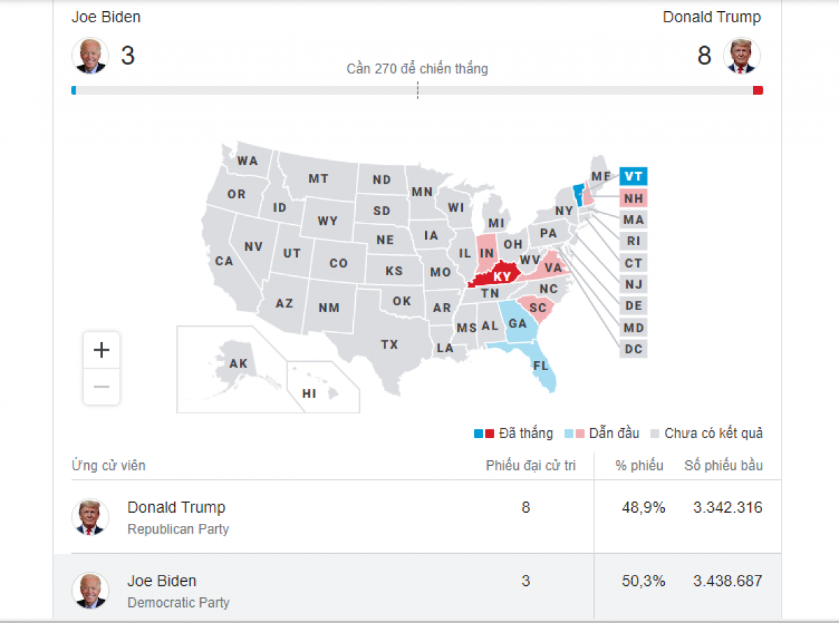 Vào 19h tối 3/11, một số bang đã đóng cửa hòm phiếu và bắt đầu công bố người chiến thắng trong cuộc đua vào Nhà Trắng năm 2020. Bang được theo dõi sát sao nhất hiện nay là Georgia, nơi Tổng thống Trump gần như chắc chắn phải thắng nếu ông muốn tiếp tục nhiệm kỳ thứ hai ở Nhà Trắng. Dù vậy, vẫn còn quá sớm để dự đoán người chiến thắng ở bang chiến địa quan trọng này. Theo Fox News, ông Biden sẽ đánh bại ông Trump ở Virginia và sẽ chiến thắng ở Vermont.