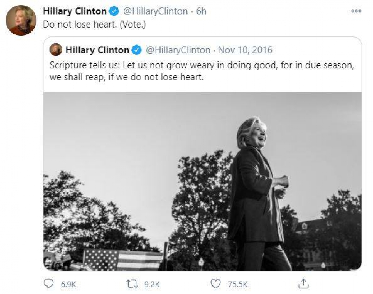 Bà Hillary Clinton đã chia sẻ lại những dòng tweet của bà sau Ngày Bầu cử năm 2016, sau khi ứng viên đảng Dân chủ này thất bại trước ông Donald Trump với thông điệp rằng: "Đừng để mất nhiệt huyết. (Hãy bỏ phiếu)". Dòng trạng thái mới này được viết kèm với bức ảnh mà bà Hillary Clinton chia sẻ ngày 9/11/2016 cho thấy cựu Ngoại trưởng Mỹ đang mỉm cười dù thất bại trước đối thủ đảng Cộng hòa Donald Trump.