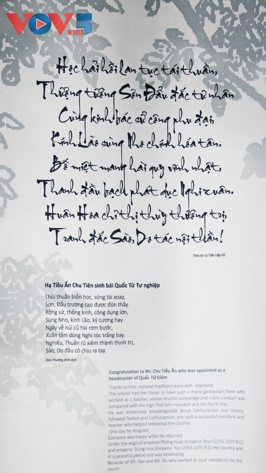 | Trưng bày là sự phối hợp tuyệt vời giữa lịch sử và hiện đại. Nó không chỉ khái quát cuộc đời và sự nghiệp của thầy giáo Chu Văn An mà còn nói đến triết lý của ông và nhân cách mà thầy đã trao truyền cho các thế hệ sau. Chính vì thế, khi được trưng bày trong không gian đặc biệt ở Văn Miếu-Quốc Tử Giám càng làm cho các tư liệu về thầy Chu Văn An rất thật, hơn là cách chúng ta ngồi và đọc trên internet hay đọc trong sách vở. |