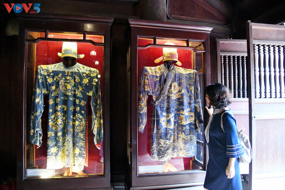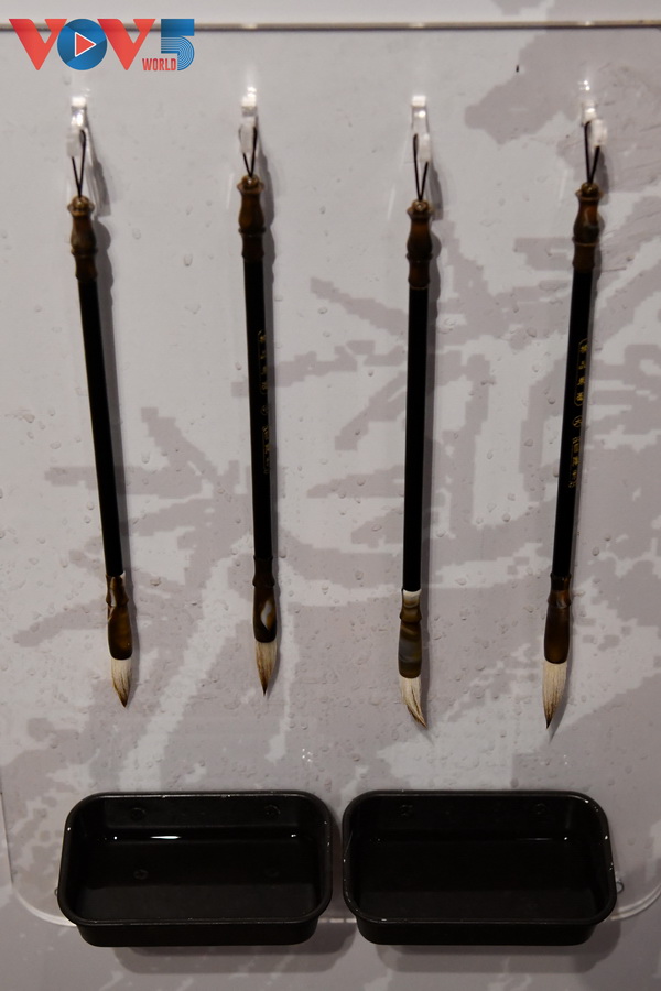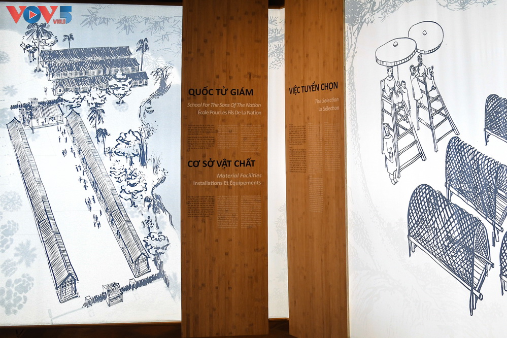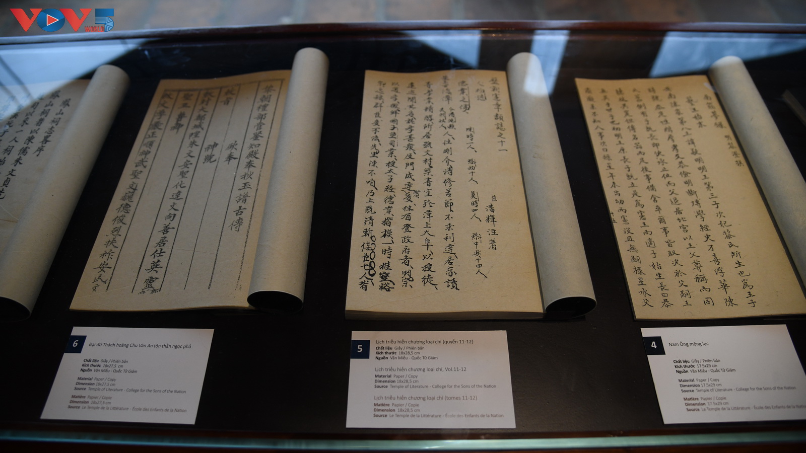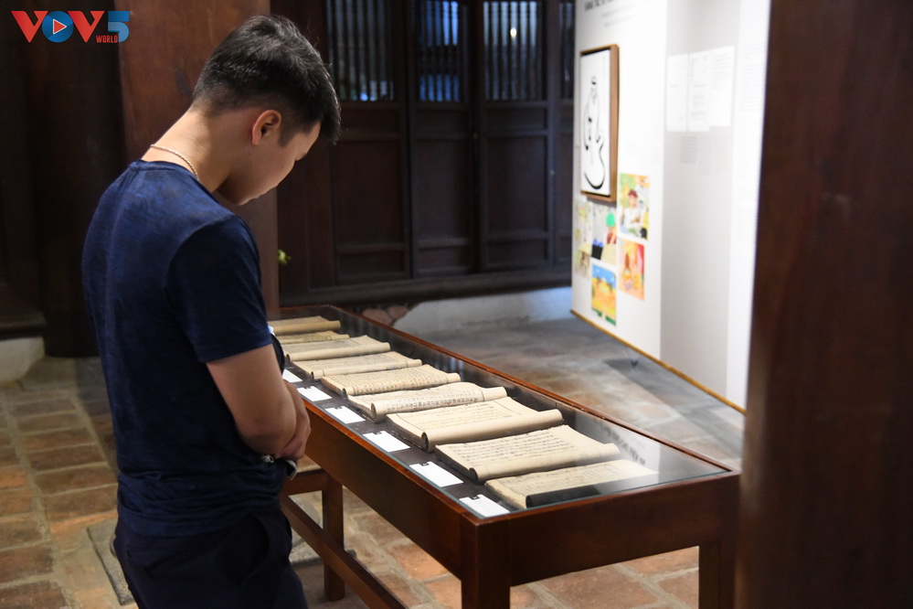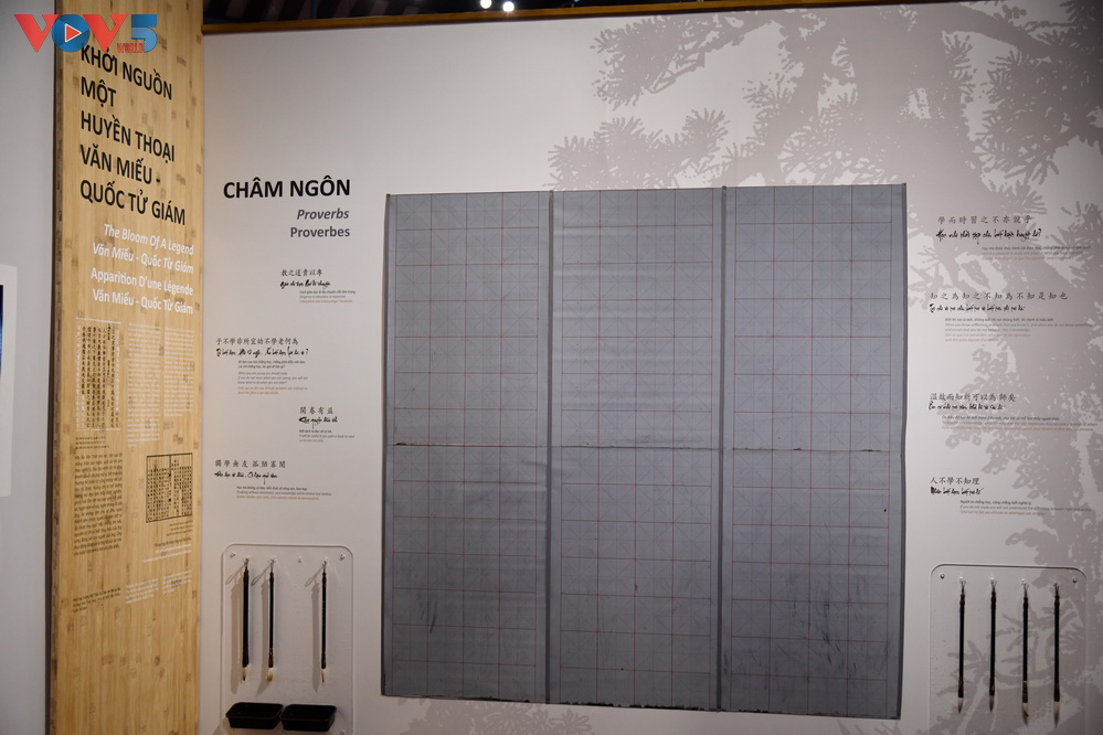 | Tại khu trưng bày, giới thiệu về Quốc Tử Giám, du khách có thể gặp những đồ dùng của sĩ tử thời trước như bút nghiên, sách học, giấy tập viết chữ... |