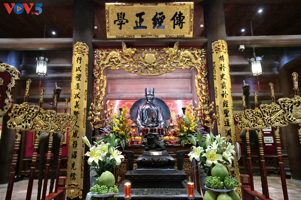 | Trưng bày góp phần giúp du khách hiểu hơn về nhân cách, cuộc đời, sự nghiệp và tấm gương thầy giáo Chu Văn An. Trưng bày diễn ra tới hết ngày 31/12/2020. Ảnh: Tượng thờ Chu Văn An - Tư nghiệp trường Quốc Tử Giám trong Văn Miếu./. |