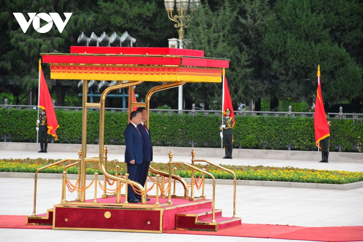 Tổng Bí thư, Chủ tịch nước Tập Cận Bình nồng nhiệt chào đón Tổng Bí thư, Chủ tịch nước Tô Lâm thăm cấp Nhà nước tới Trung Quốc trên cương vị mới; Tổng Bí thư, Chủ tịch nước Tập Cận Bình mời Tổng Bí thư, Chủ tịch nước Tô Lâm bước lên bục danh dự. Quân nhạc cử quốc thiều Việt Nam và Trung Quốc.