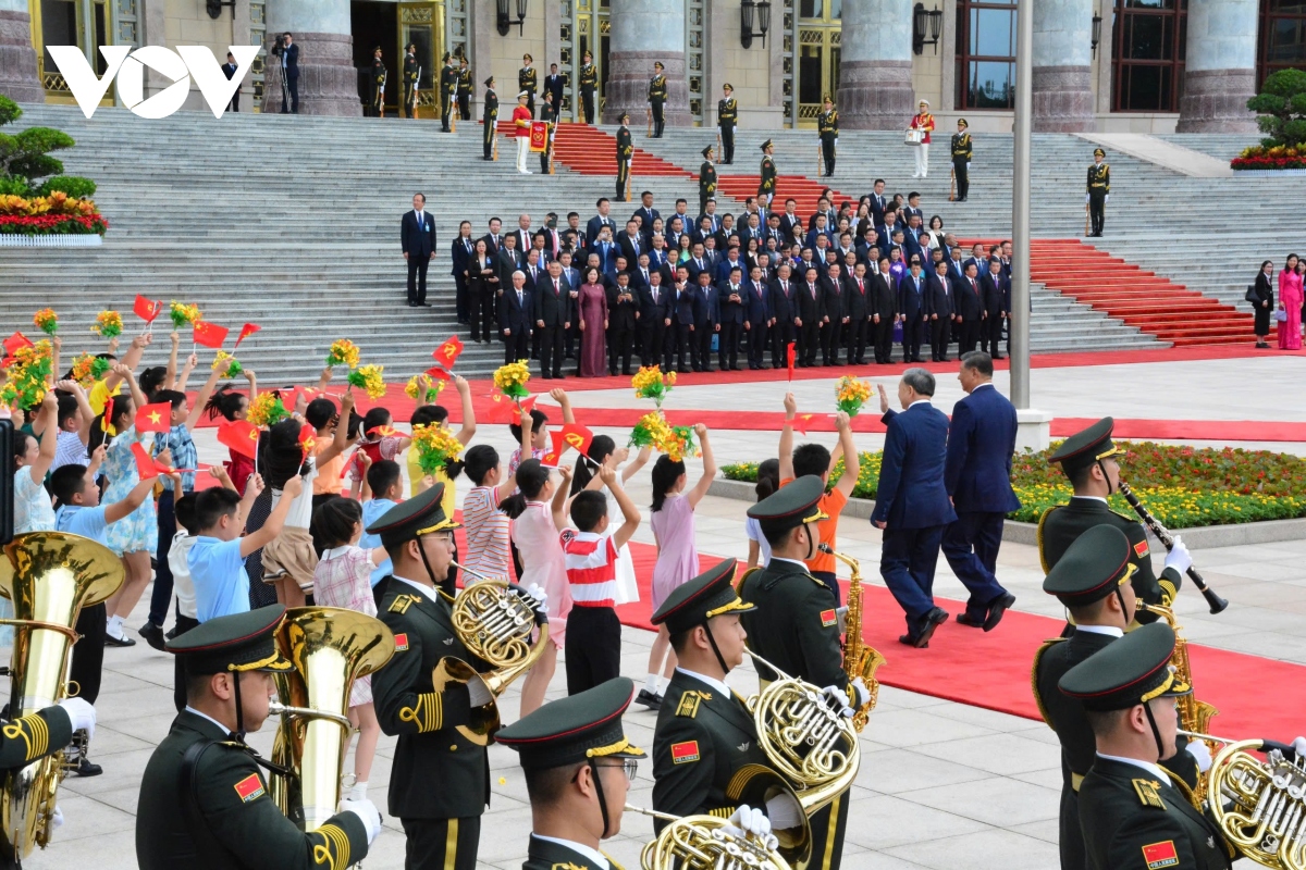 Tiếp đó, Tổng Bí thư, Chủ tịch nước Tập Cận Bình và Tổng Bí thư, Chủ tịch nước Tô Lâm duyệt đội danh dự Quân giải phóng Nhân dân Trung Quốc, đông đảo các cháu thiếu nhi Trung Quốc trong những bộ trang phục rực rỡ, nồng nhiệt vẫy cờ, hoa chào mừng Tổng Bí thư, Chủ tịch nước Tô Lâm và Đoàn đại biểu cấp cao nước ta.