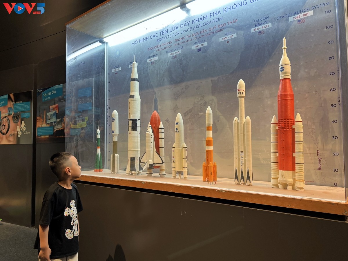 Một em bé chăm chú ngắm mô hình các tên lửa đẩy khám phá không gian. |