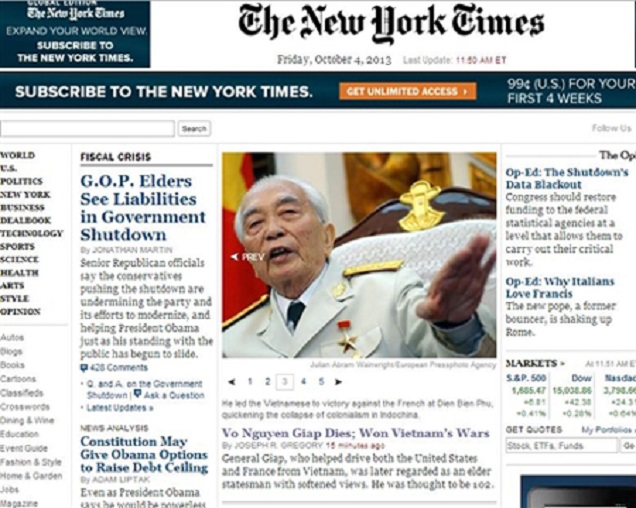 Trang báo điện tử của The New York Times đưa tin về Đại tướng Võ Nguyên Giáp ngày 4/10/2013. Ảnh chụp màn hình